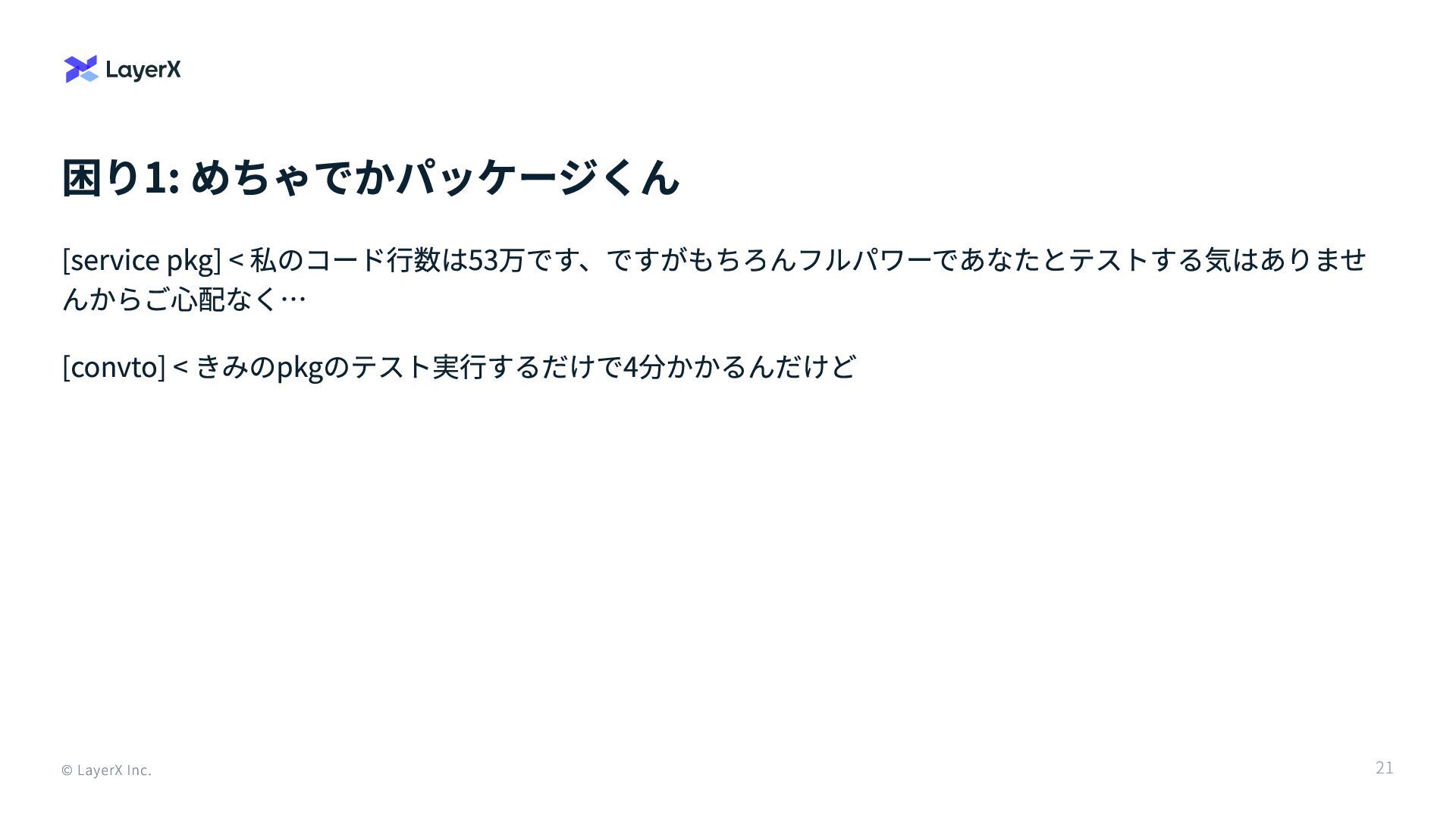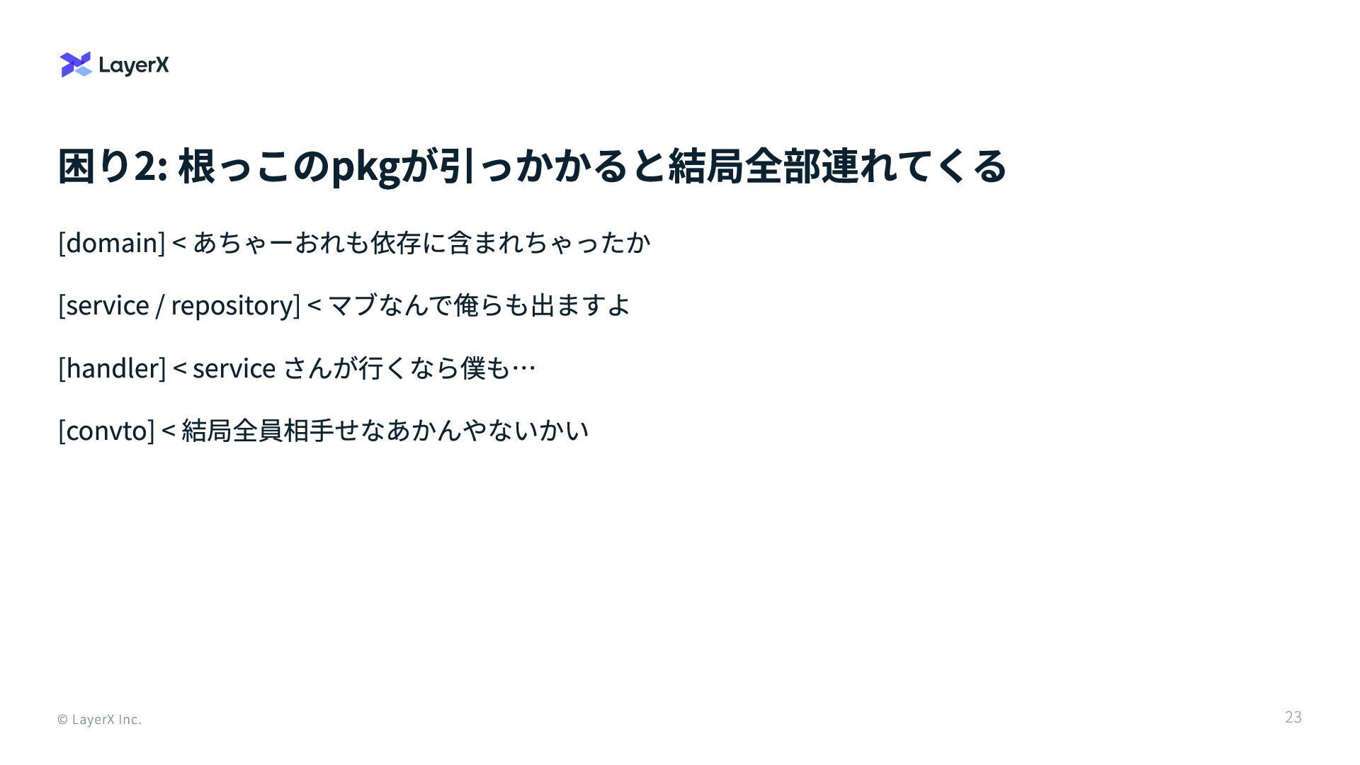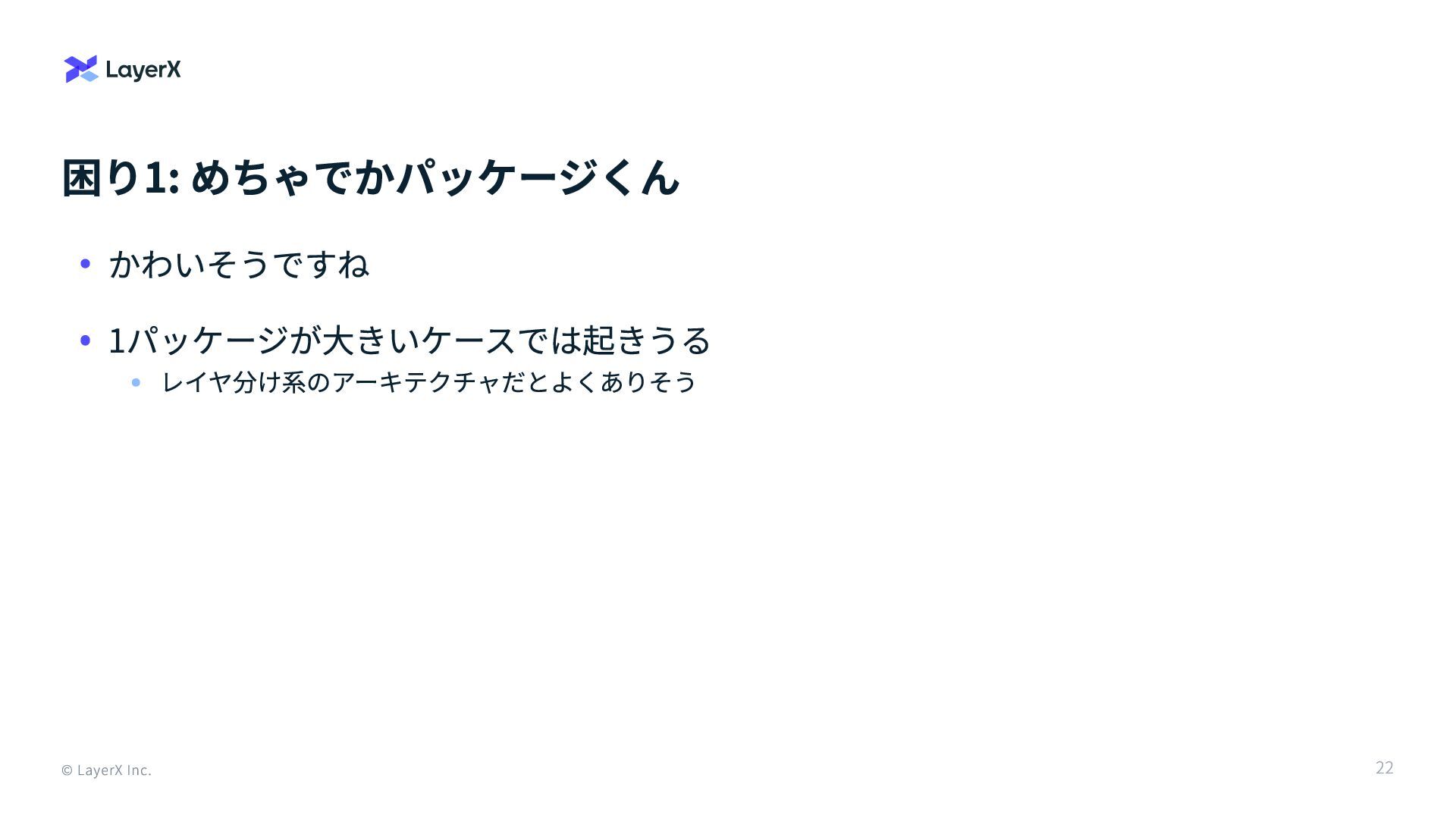困り1: めちゃでかパッケージくん © LayerX Inc. かわいそうですね 1パッケージが大きいケースでは起きうる レイヤ分け系のアーキテクチャだとよくありそう 22