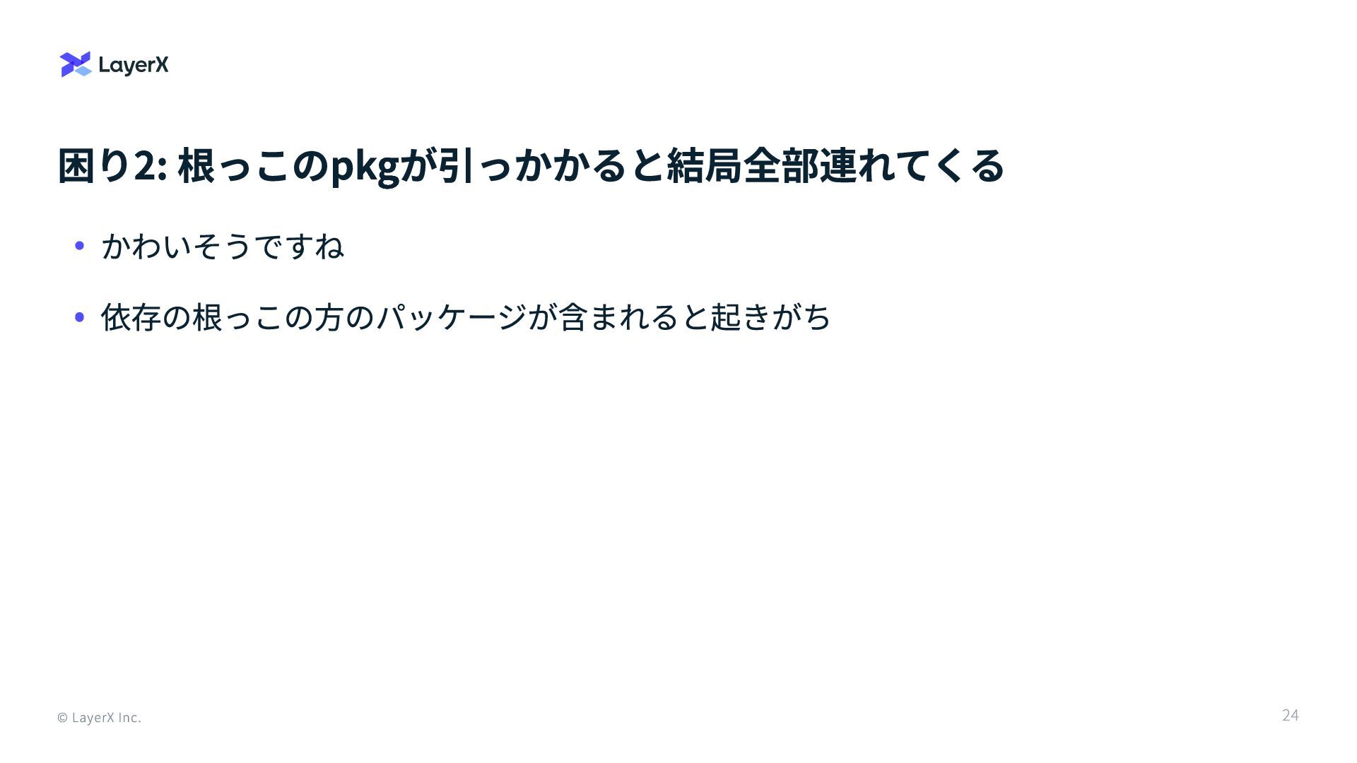 困り2: 根っこのpkgが引っかかると結局全部連れてくる © LayerX Inc. かわいそうですね 依存の根っこの方のパッケージが含まれると起きがち 24