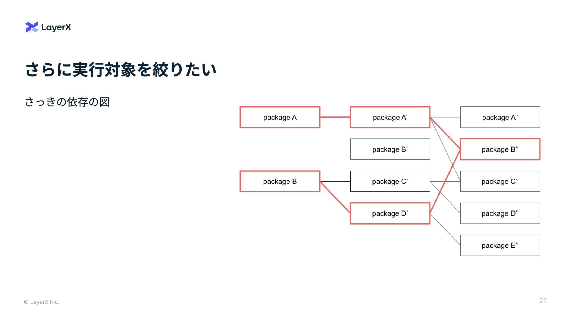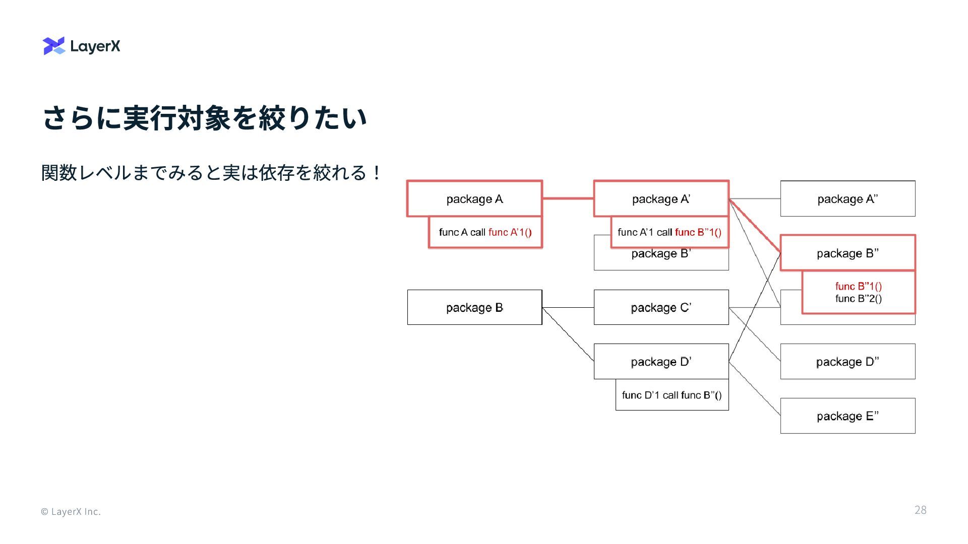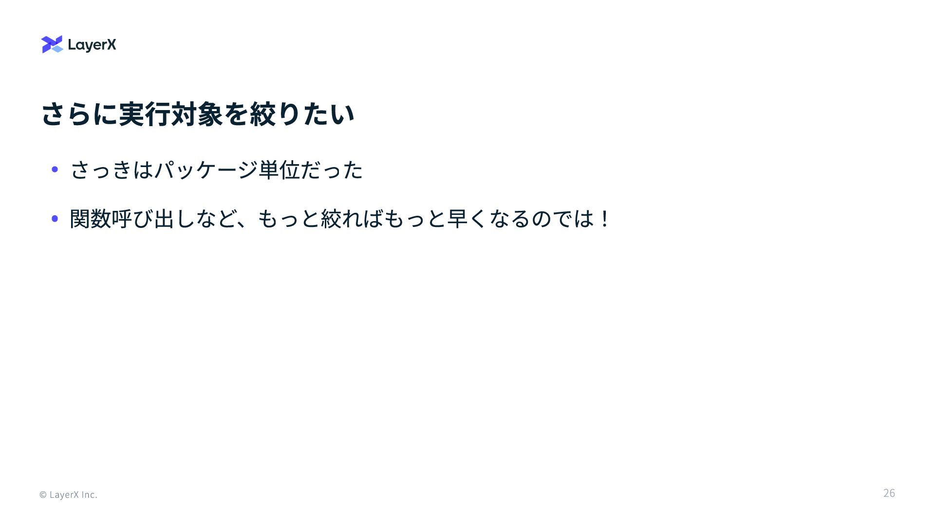 さらに実行対象を絞りたい © LayerX Inc. さっきはパッケージ単位だった 関数呼び出しなど、もっと絞ればもっと早くなるのでは! 26