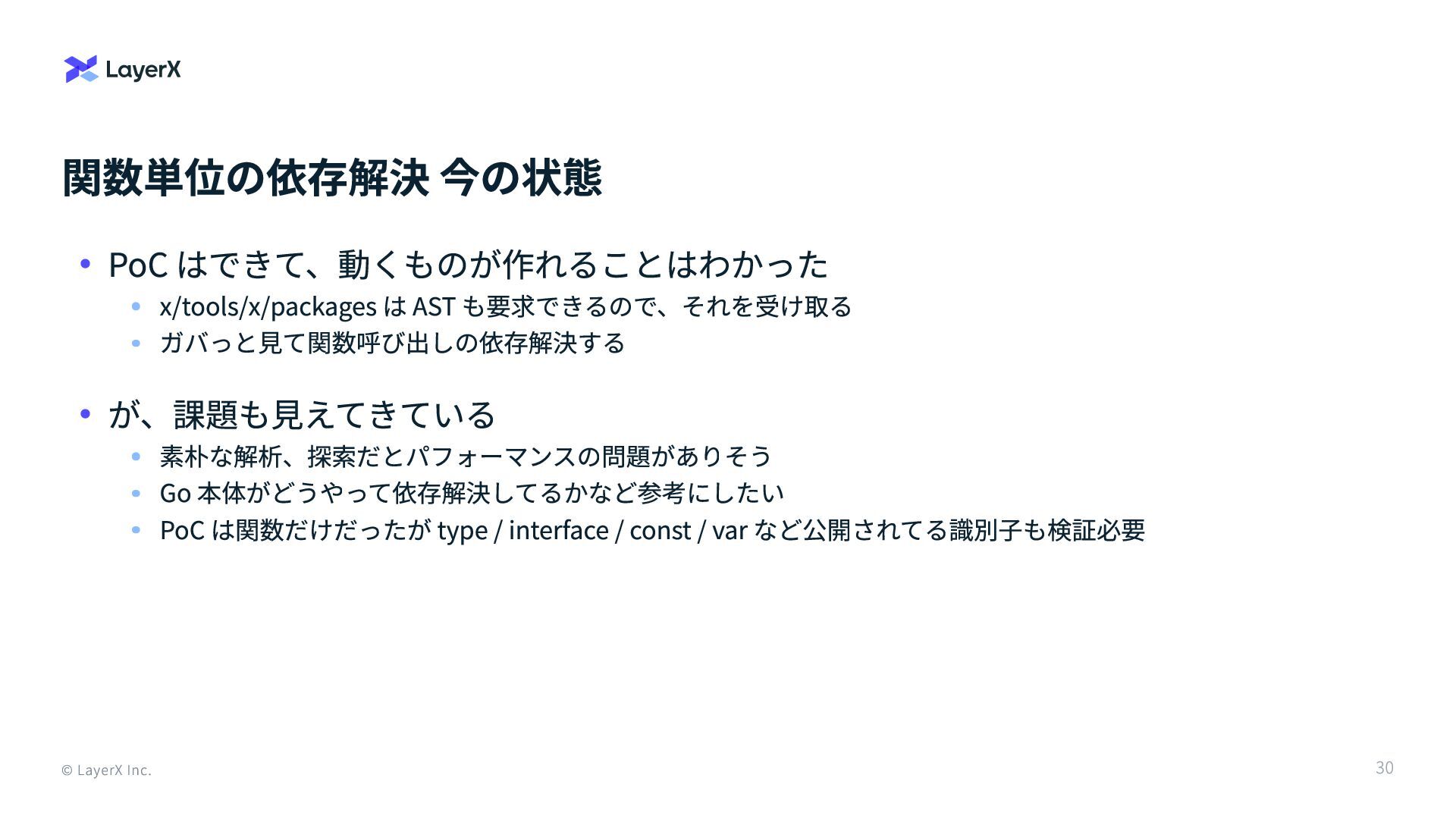 も要求できるので、それを受け取る ガバっと見て関数呼び出しの依存解決する が、課題も見えてきている 素朴な解析、探索だとパフォーマンスの問題がありそう Go 本体がどうやって依存解決してるかなど参考にしたい PoC は関数だけだったが type / interface / const / var など公開されてる識別子も検証必要 30