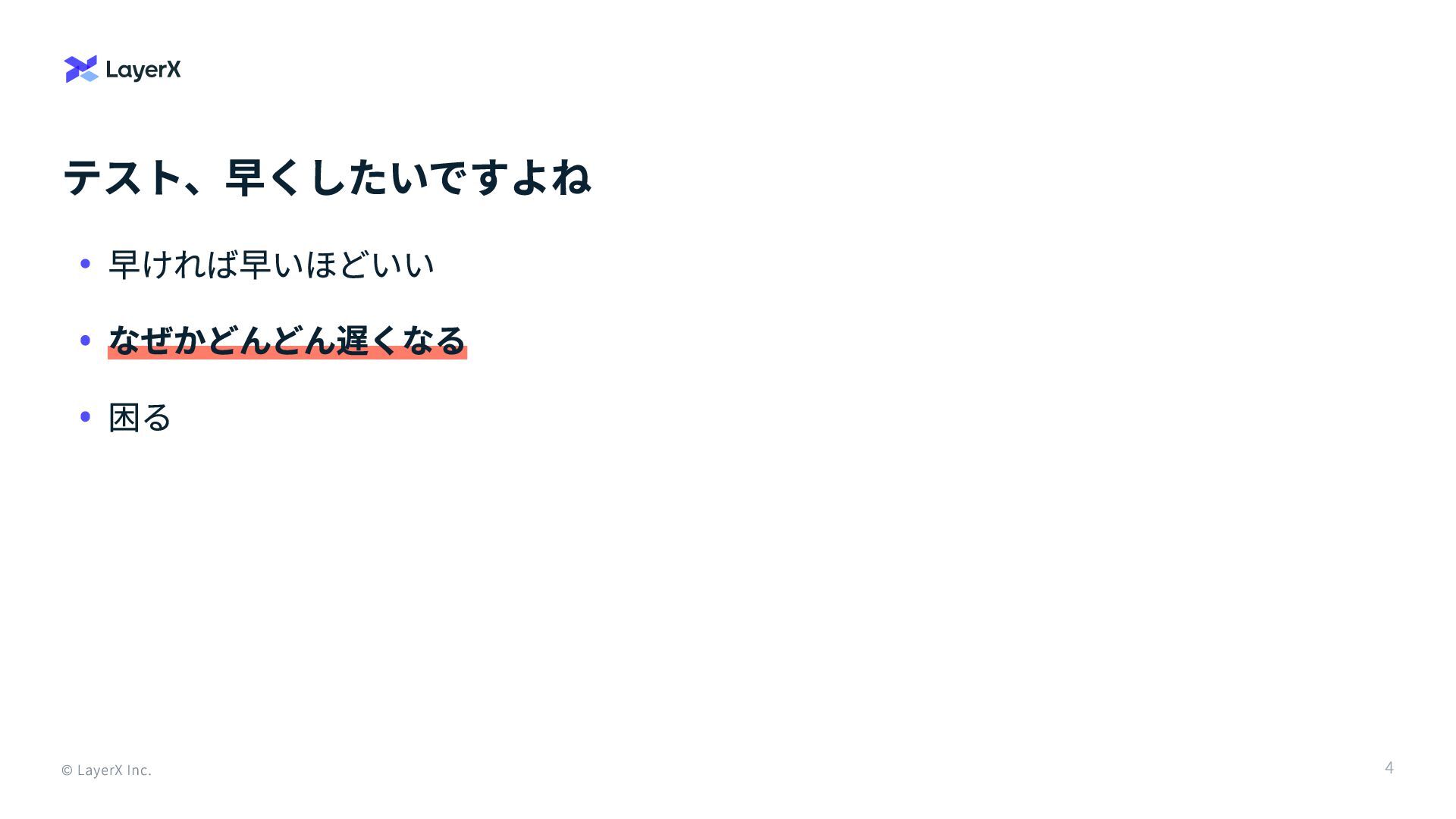 テスト、早くしたいですよね © LayerX Inc. 早ければ早いほどいい なぜかどんどん遅くなる 困る 4