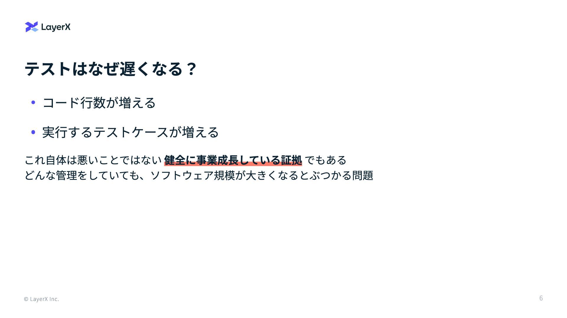 テストはなぜ遅くなる? © LayerX Inc. コード行数が増える 実行するテストケースが増える 5