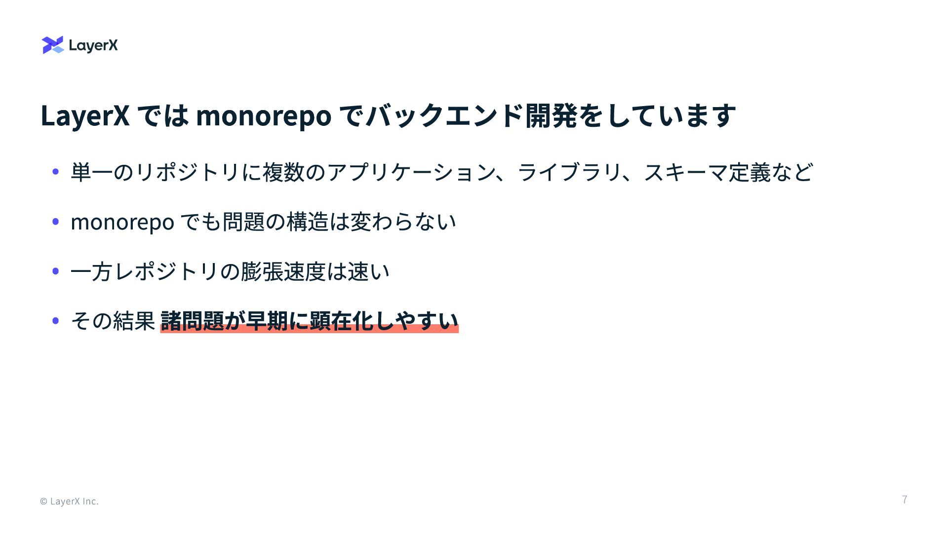 LayerX では monorepo でバックエンド開発をしています © LayerX Inc. 単一のリポジトリに複数のアプリケーション、ライブラリ、スキーマ定義など monorepo でも問題の構造は変わらない