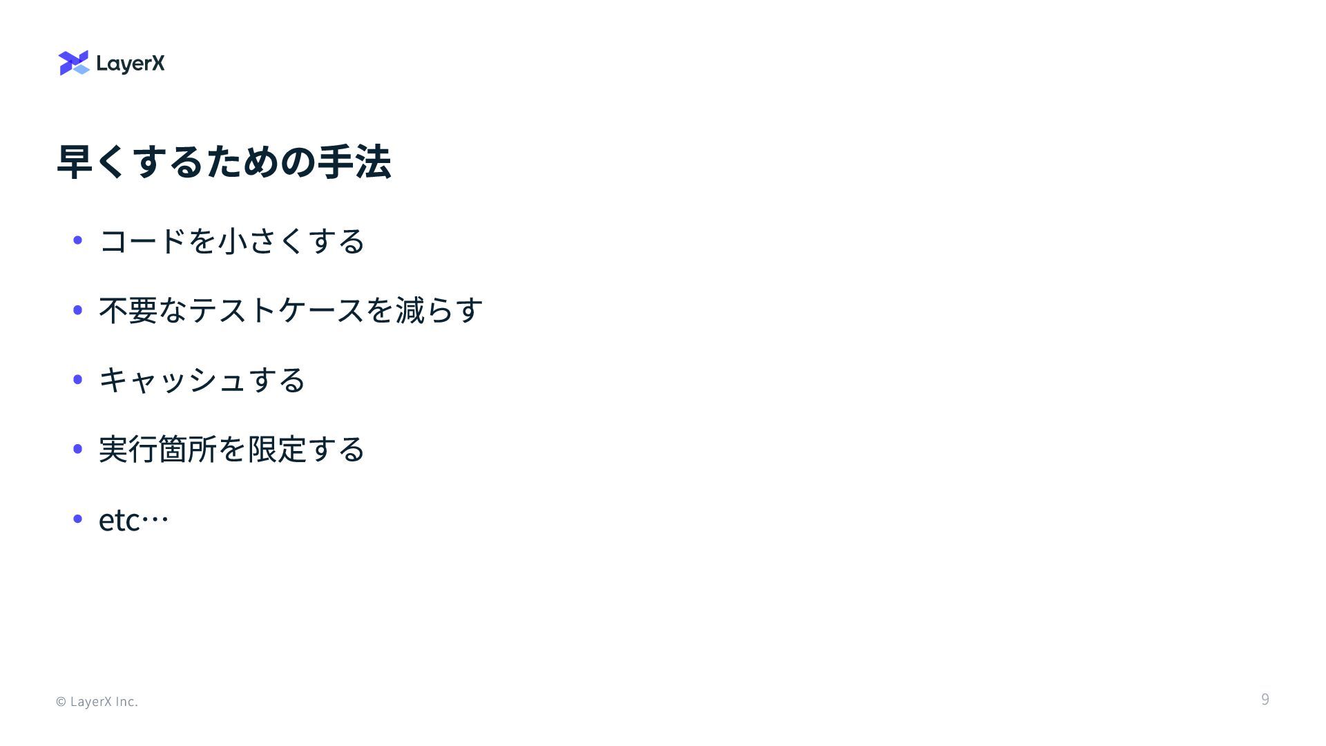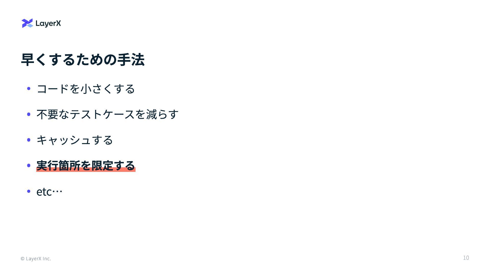 早くするための手法 © LayerX Inc. コードを小さくする 不要なテストケースを減らす キャッシュする 実行箇所を限定する etc… 9