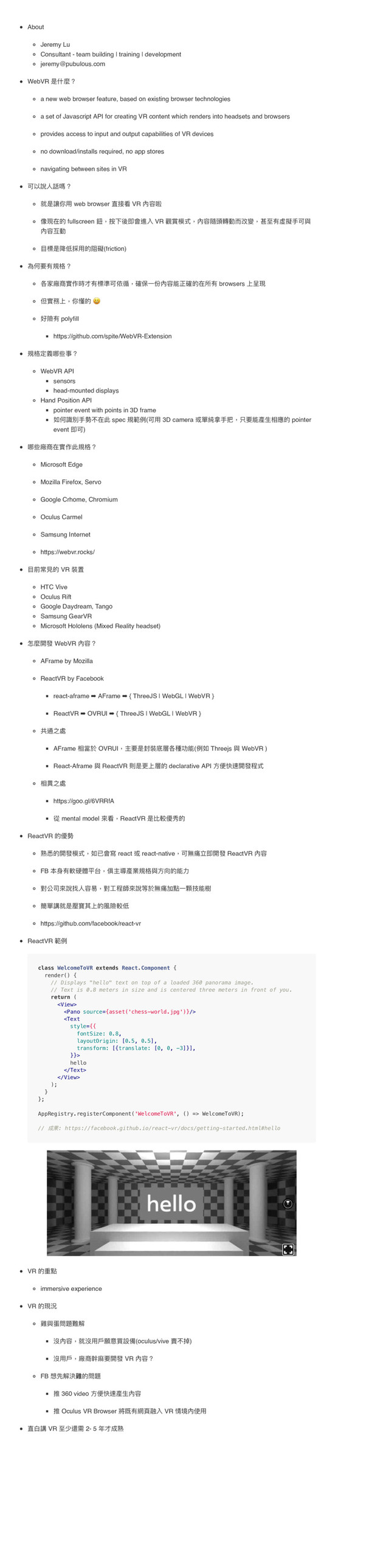 [email protected] WebVR ฎՋ讕牫 a new web browser feature, based on existing browser technologies a set of Javascript API for creating VR content which renders into headsets and browsers provides access to input and output capabilities of VR devices no download/installs required, no app stores navigating between sites in VR ݢ犥藯Ո扖㻟牫 疰ฎ虏֦አ web browser ፗ矑፡ VR 獉ࠩ 猟匍ࣁጱ fullscreen 衔牧ೲӥ盅ܨ䨝蝱獈 VR 薪搕秇ୗ牧獉褰毣旉㵕ᘒ硬虋牧綍ᛗ磪蒅硈ಋݢ膏 獉㵕 ፓ秂ฎ褔犵䟖አጱᴥ繸(friction) 傶֜ᥝ磪憒໒牫 ݱ疑皜珶䋿֢碻磪秂伛ݢ狅盌牧嘦狒Ӟ犩獉胼ྋ嘦ጱࣁಅ磪 browsers Ӥ珊匍 ֕䋿率Ӥ牧֦睞ጱ ! অ檺磪 polyfill https://github.com/spite/WebVR-Extension 憒໒ਧ嬝ߺ犚Ԫ牫 WebVR API sensors head-mounted displays Hand Position API pointer event with points in 3D frame ই֜蘷獨ಋ玊犋ࣁ種 spec 憒塅ֺ(ݢአ 3D camera 㻌奈೭ಋ牧ݝᥝ胼叨ኞፘ䛑ጱ pointer event ܨݢ) ߺ犚皜珶ࣁ䋿֢種憒໒牫 Microsoft Edge Mozilla Firefox, Servo Google Crhome, Chromium Oculus Carmel Samsung Internet https://webvr.rocks/ ፓ獮ଉ憎ጱ VR 蕕ᗝ HTC Vive Oculus Rift Google Daydream, Tango Samsung GearVR Microsoft Hololens (Mixed Reality headset) ெ讕樄咳 WebVR 獉牫 AFrame by Mozilla ReactVR by Facebook react-aframe ➡ AFrame ➡ { ThreeJS | WebGL | WebVR } ReactVR ➡ OVRUI ➡ { ThreeJS | WebGL | WebVR } و蝢ԏ蒂 AFrame ፘ吚ෝ OVRUI牧Ԇᥝฎ蕕皈䍅ݱ圵ۑ胼(ֺই Threejs 膏 WebVR ) React-Aframe 膏 ReactVR 㳷ฎๅӤ䍅ጱ declarative API ො盠蝧樄咳纷ୗ ፘ吖ԏ蒂 https://goo.gl/6VRRfA ℂ mental model 㬵፡牧ReactVR ฎ穉斃猻纨ጱ ReactVR ጱ猻玊 ᆧ盿ጱ樄咳秇ୗ牧ই૪䨝䌃 react react-native牧ݢ篷ዳ缏ܨ樄咳 ReactVR 獉 FB 蛪磪敟Ꮭ誢ଘݣ牧קԆ疩叨禂憒໒膏ොݻጱ胼ێ 䌘獍ݪ㬵藯ತՈฃ牧䌘ૡ纷䒍㬵藯缛ෝ篷ዳے讨Ӟ毼ದ胼䰽 墋㻌拻疰ฎ瓟䌌ٌӤጱ觓檺斃犵 https://github.com/facebook/react-vr ReactVR 塅ֺ class WelcomeToVR extends React.Component { render() { // Displays "hello" text on top of a loaded 360 panorama image. // Text is 0.8 meters in size and is centered three meters in front of you. return ( <View> <Pano source={asset('chess-world.jpg')}/> <Text style={{ fontSize: 0.8, layoutOrigin: [0.5, 0.5], transform: [{translate: [0, 0, -3]}], }}> hello </Text> </View> ); } }; AppRegistry.registerComponent('WelcomeToVR', () => WelcomeToVR); // ౮ຎ: https://facebook.github.io/react-vr/docs/getting-started.html#hello VR ጱ᯿讨 immersive experience VR ጱ匍丆 櫚膏ᢓ㺔氂櫞薹 ䷱獉牧疰䷱አ䜛氎揮戔猋(oculus/vive 搚犋ധ) ䷱አ䜛牧皜珶䓄讔ᥝ樄咳 VR 獉牫 FB మض薹究櫚ጱ㺔氂 വ 360 video ො盠蝧叨ኞ獉 വ Oculus VR Browser 疥碪磪翕殷ᣟ獈 VR 眐ह獉ֵአ ፗጮ拻 VR ᛗ螭襑 2- 5 ଙ౮ᆧ