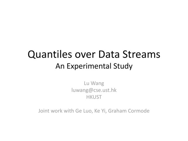 ESCAPE 2007 Random Subset Sum 1 2 log2 Gilbert et al. VLDB 2002 DCM 1 log2 Cormode & Muthukrishnan J. of Algorithms 2005 DCS 1 log1.5 New * Small log factors are ignored.