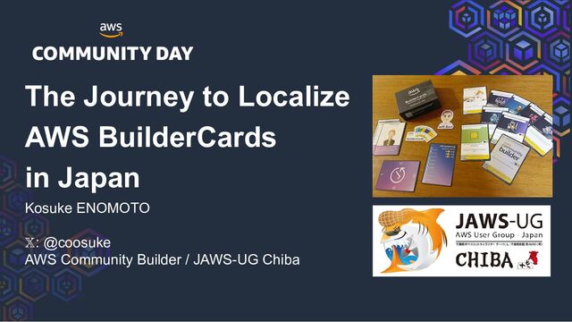 - The process of localizing AWS BuilderCards from English to Japanese, tailored specifically for the AWS community in Japan, beyond mere translation.