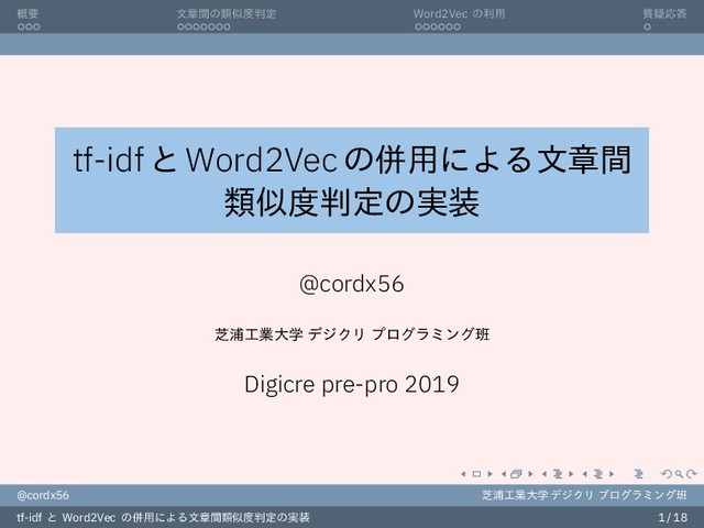 ‌ ‌ ‌ ‌ ‌ ‌ ‌ ‌ ‌ ‌ ‌ ‌ ‌ ‌ ‌ ‌ ‌ ‌ ‌ ‌ ‌ ‌ ‌ ‌ ‌ ‌ ‌ ‌ ‌ ‌ ֓ཁ จষؒͷྨࣅ౓൑ఆ Word2Vec ͷར༻ ࣭ٙԠ౴ tf-idfͱWord2Vecͷซ༻ʹΑΔจষؒ ྨࣅ౓൑ఆͷ࣮૷ @cordx56 ࣳӜ޻ۀେֶ σδΫϦ ϓϩάϥϛϯά൝ Digicre pre-pro 2019 @cordx56 ࣳӜ޻ۀେֶ σδΫϦ ϓϩάϥϛϯά൝ tf-idf ͱ Word2Vec ͷซ༻ʹΑΔจষؒྨࣅ౓൑ఆͷ࣮૷ 1 / 18