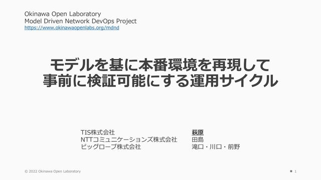 policy-statement ospf-redistribute from protocol direct set policy-options policy-statement ospf-redistribute from protocol static set policy-options policy-statement ospf-redistribute then accept set protocols ospf export ospf-redistribute 動的経路制御や 経路再配布などの動作は、 構成・状況によって変化するため 正確に予測したり 事前に問題に気付くには 知識や経験が必要 !! "システム全体"を再現し、 動作を検証することで 問題を発見・対処し 不確実さを減らす サーバへの通信トラブル発見 原因調査 As is To be Original Emulated root@regionb-svr01:/# traceroute 192.168.100.10 traceroute to 192.168.100.10 (192.168.100.10), 30 hops max, 60 byte packets 1 192.168.254.1 (192.168.254.1) 4.540 ms 3.914 ms 4.254 ms 2 192.168.1.1 (192.168.1.1) 5.653 ms 4.949 ms 5.266 ms 3 172.16.0.1 (172.16.0.1) 6.726 ms 6.818 ms 6.645 ms 4 192.168.0.2 (192.168.0.2) 8.979 ms 9.168 ms 8.845 ms 5 192.168.0.2 (192.168.0.2) 3069.192 ms !H 3069.168 ms !H 3069.147 ms !H サーバへの通信 ping 196.168.100.10 移転サーバ 192.168.100.10 ノードは すべて コンテナ Emulated Env.