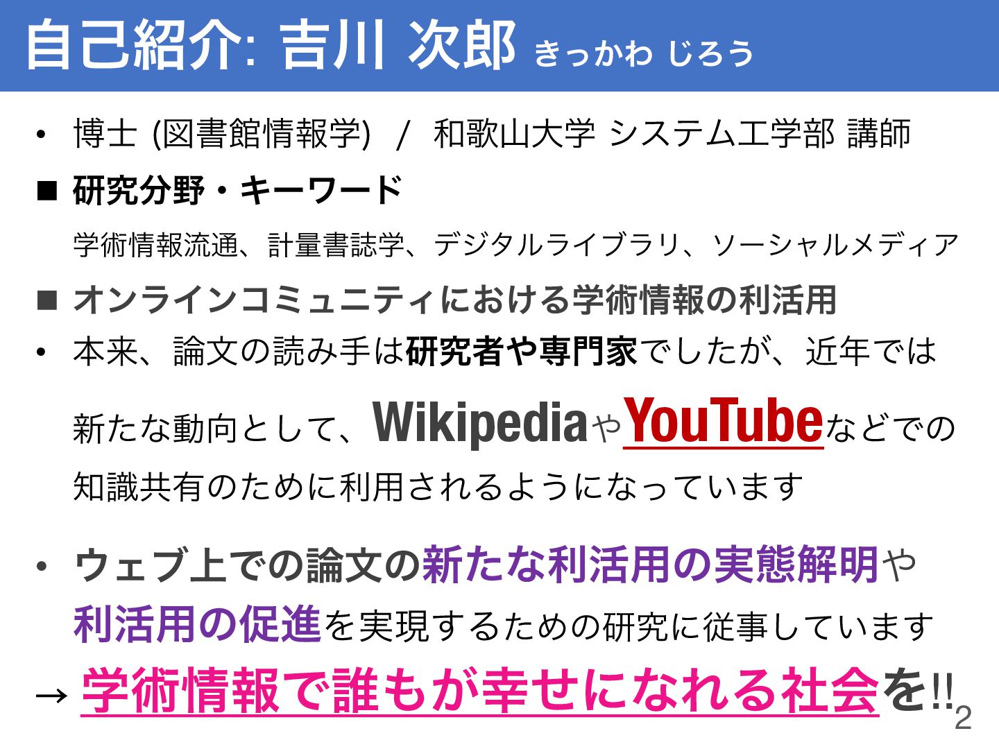 • ຊདྷɺ࿦จͷಡΈख͸ݚڀऀ΍ઐ໳ՈͰ͕ͨ͠ɺۙ೥Ͱ͸ ৽ͨͳಈ޲ͱͯ͠ɺWikipedia΍ YouTubeͳͲͰͷ ஌ࣝڞ༗ͷͨΊʹར༻͞ΕΔΑ͏ʹͳ͍ͬͯ·͢ • ΢Σϒ্Ͱͷ࿦จͷ৽ͨͳར׆༻ͷ࣮ଶղ໌΍ ར׆༻ͷଅਐΛ࣮ݱ͢ΔͨΊͷݚڀʹैࣄ͍ͯ͠·͢ ˠֶज़৘ใͰ୭΋͕޾ͤʹͳΕΔࣾձΛ!! ࣗݾ঺հ:٢઒ ࣍࿠ ͖͔ͬΘ͡Ζ͏