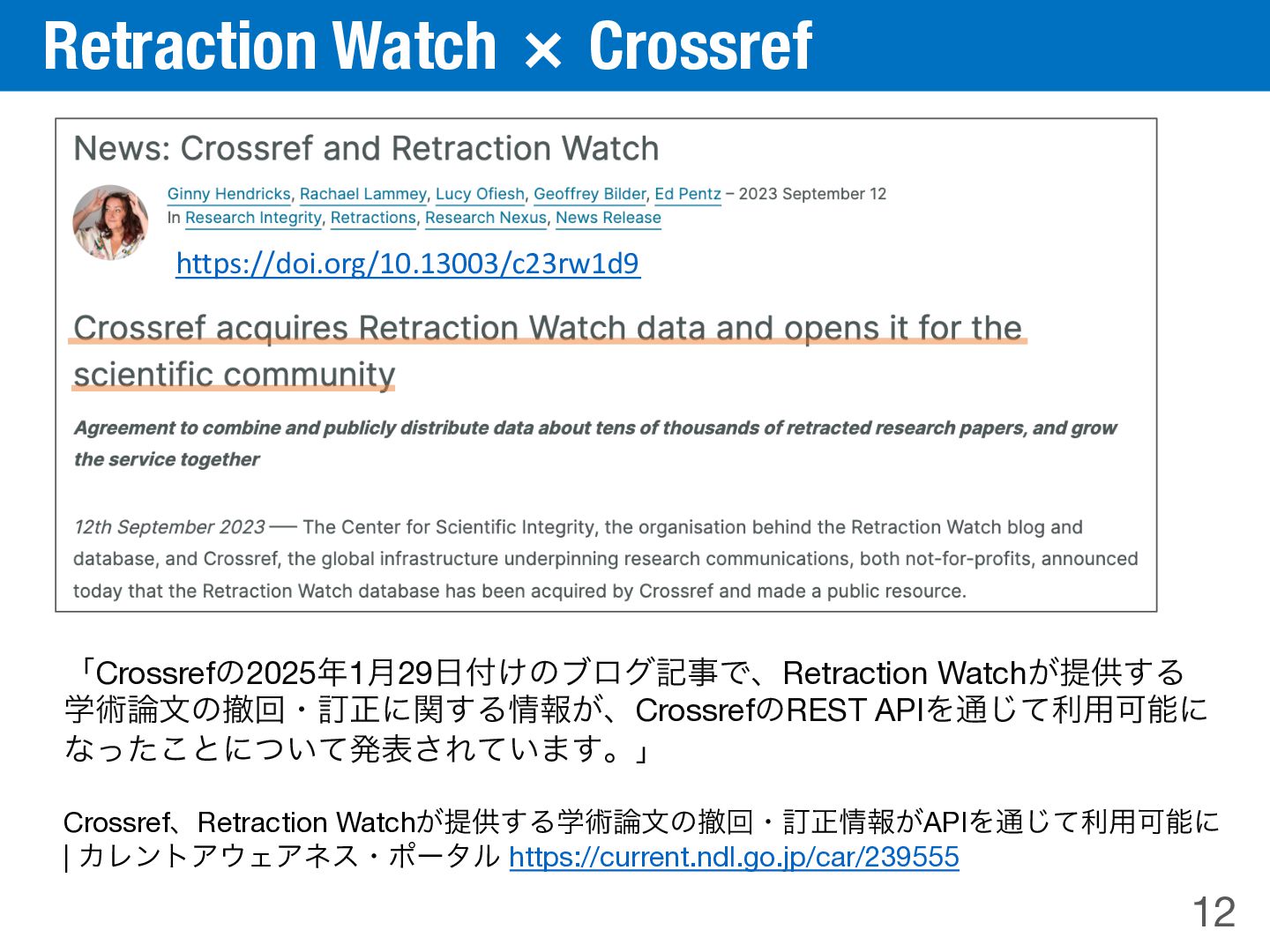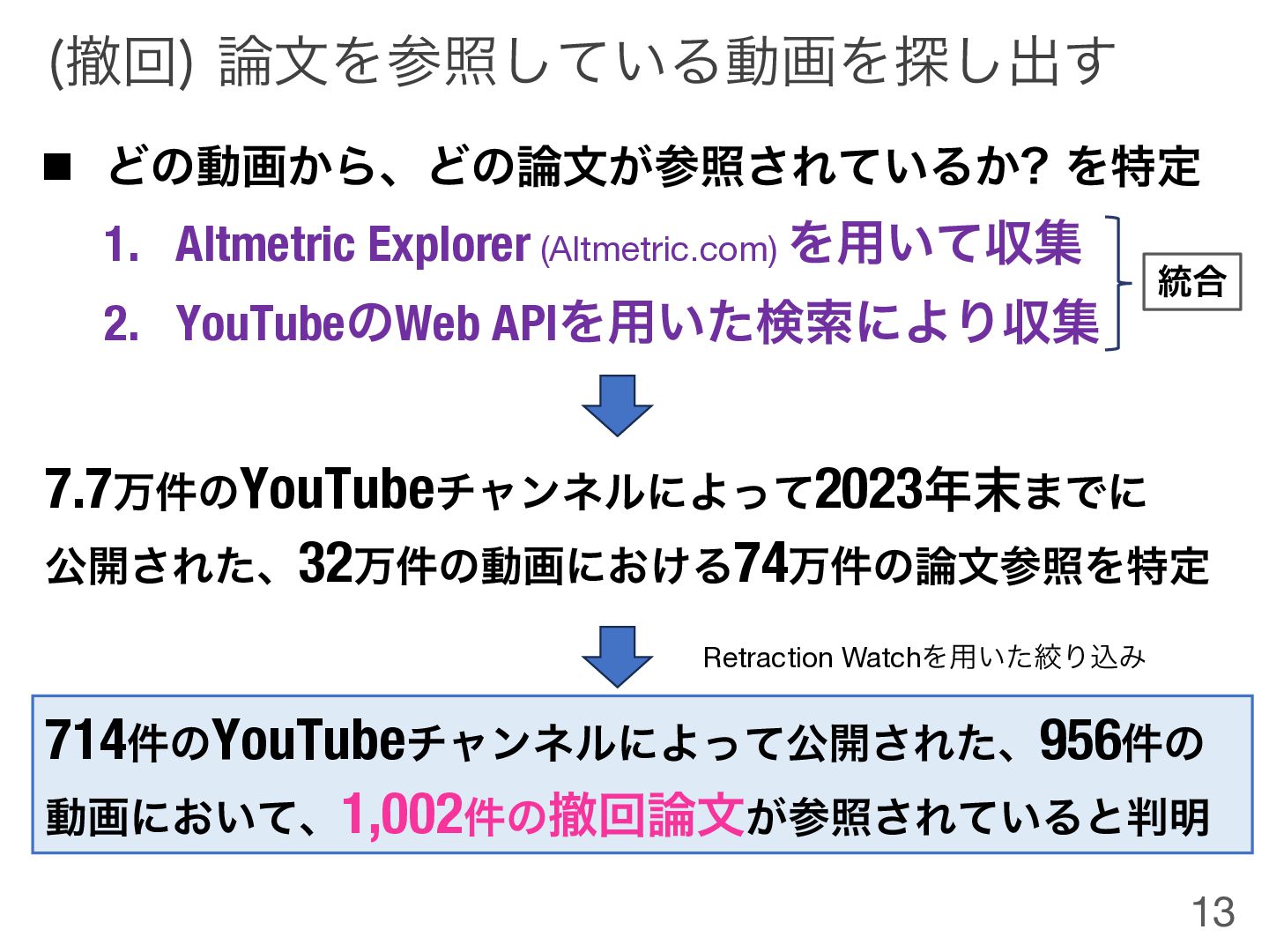 Λ༻͍ͯऩू 2. YouTubeͷWeb APIΛ༻͍ͨݕࡧʹΑΓऩू 7.7ສ݅ͷYouTubeνϟϯωϧʹΑͬͯ2023೥຤·Ͱʹ ެ։͞Εͨɺ32ສ݅ͷಈըʹ͓͚Δ74ສ݅ͷ࿦จࢀরΛಛఆ 714݅ͷYouTubeνϟϯωϧʹΑͬͯެ։͞Εͨɺ956݅ͷ ಈըʹ͓͍ͯɺ1,002݅ͷఫճ࿦จ͕ࢀর͞Ε͍ͯΔͱ൑໌ Retraction WatchΛ༻͍ͨߜΓࠐΈ ౷߹