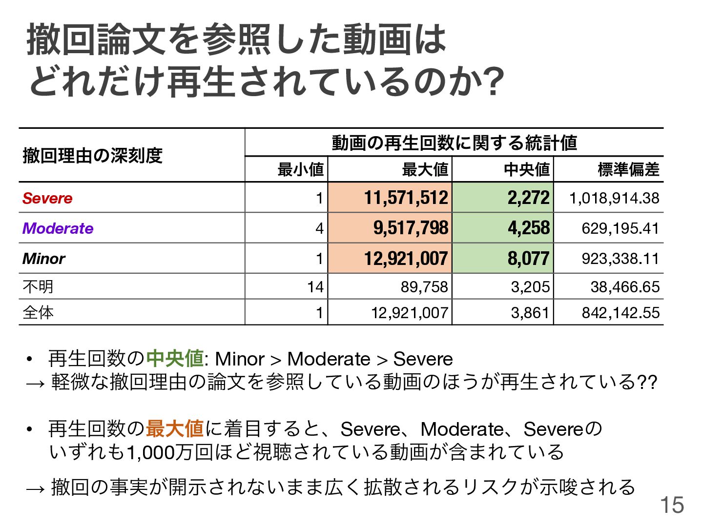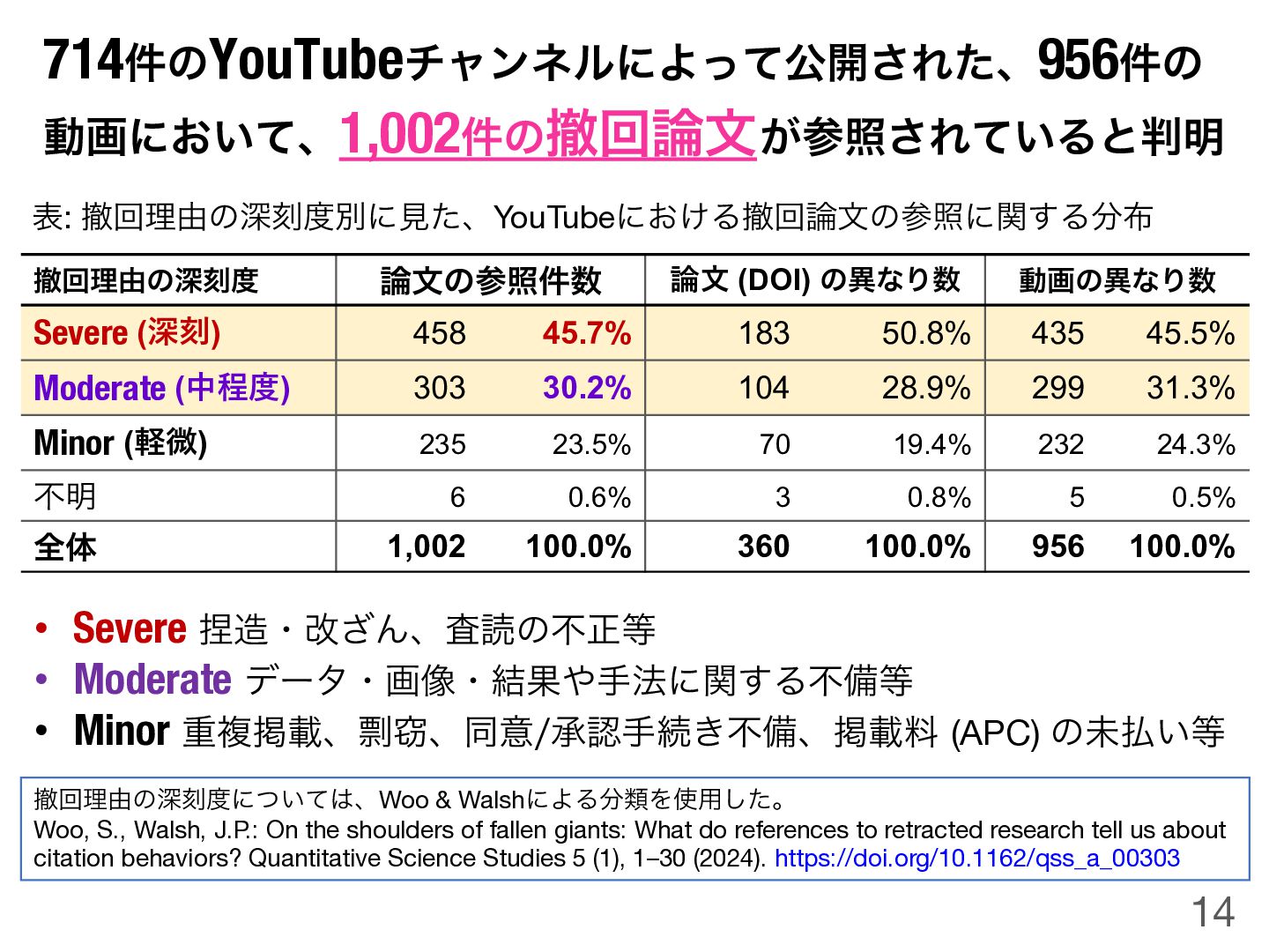of fallen giants: What do references to retracted research tell us about citation behaviors? Quantitative Science Studies 5 (1), 1–30 (2024). https://doi.org/10.1162/qss_a_00303 14 ఫճཧ༝ͷਂࠁ౓ ࿦จͷࢀর݅਺ 論⽂ (DOI) ͷҟͳΓ਺ ಈըͷҟͳΓ਺ Severe (深刻) 458 45.7% 183 50.8% 435 45.5% Moderate (中程度) 303 30.2% 104 28.9% 299 31.3% Minor (軽微) 235 23.5% 70 19.4% 232 24.3% ෆ໌ 6 0.6% 3 0.8% 5 0.5% શମ 1,002 100.0% 360 100.0% 956 100.0% ද: ఫճཧ༝ͷਂࠁ౓ผʹݟͨɺYouTubeʹ͓͚Δఫճ࿦จͷࢀরʹؔ͢Δ෼෍ 714݅ͷYouTubeνϟϯωϧʹΑͬͯެ։͞Εͨɺ956݅ͷ ಈըʹ͓͍ͯɺ1,002݅ͷఫճ࿦จ ͕ࢀর͞Ε͍ͯΔͱ൑໌ • Severe፻଄ɾվ͟Μɺࠪಡͷෆਖ਼౳ • Moderateσʔλɾը૾ɾ݁Ռ΍ख๏ʹؔ͢Δෆඋ౳ • MinorॏෳܝࡌɺႮ઄ɺಉҙঝೝखଓ͖ෆඋɺܝࡌྉ(APC) ͷະ෷͍౳