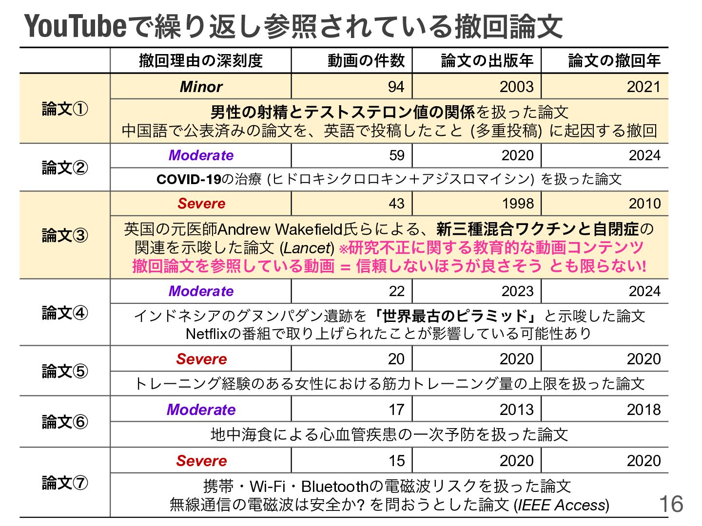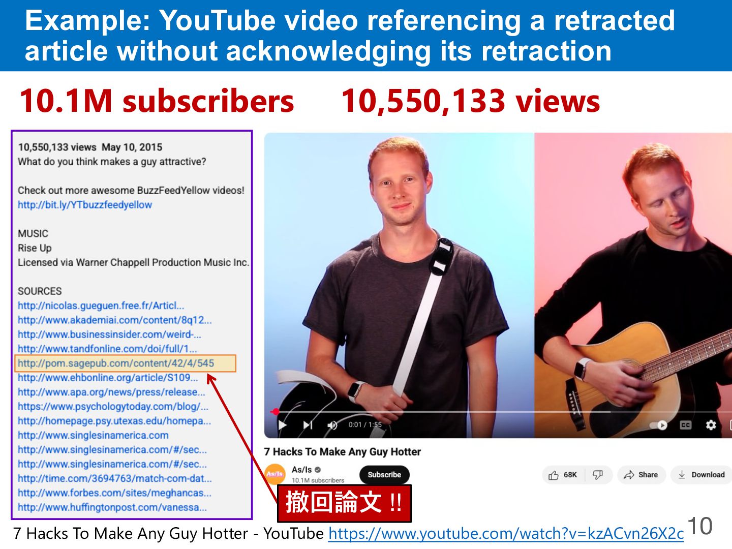 10.1M subscribers 10,550,133 views 撤回論⽂ !! Example: YouTube video referencing a retracted article without acknowledging its retraction 10