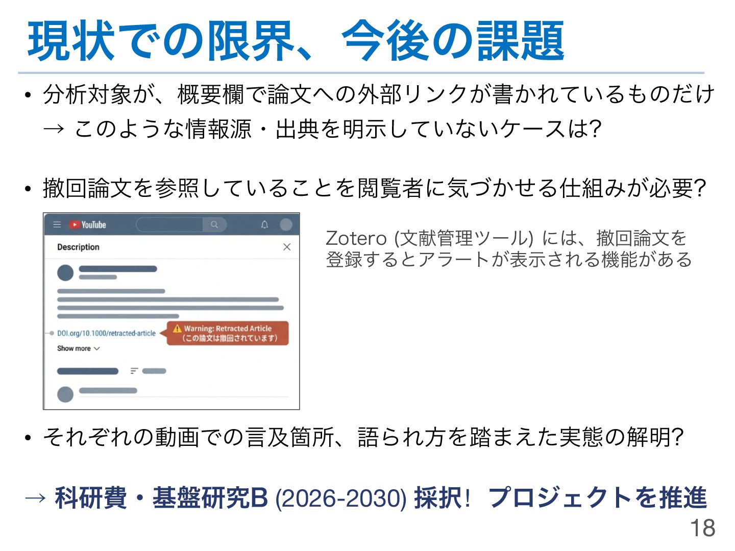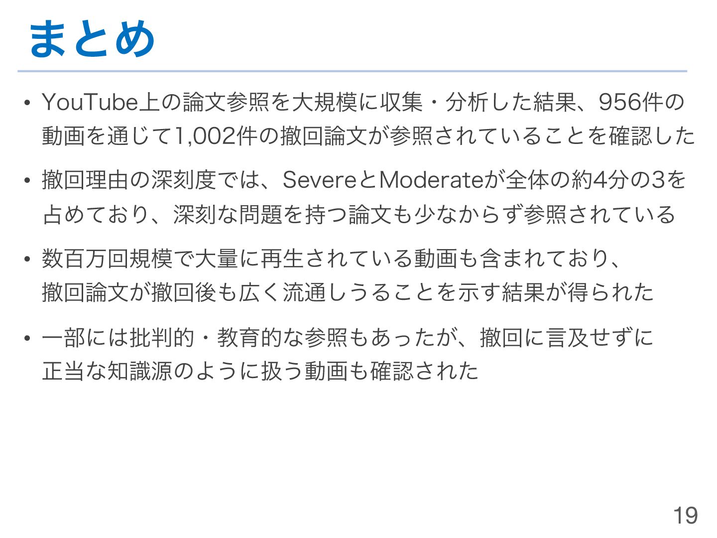 • ͦͷଞͷ෼ੳ݁Ռ͸ɺTPDL2025ʹͯൃදࡁΈ ಈը͕౤ߘ͞Εͨ λΠϛϯά 件数 撤回理由の深刻度 Severe Moderate Minor 不明 ࿦จͷఫճΑΓ΋લ 537 (53.6%) 253 (25.3%) 187 (18.9%) 97 (9.7%) 0 (0.0%) ࿦จͷఫճΑΓ΋ޙ 465 (46.4%) 205 (20.5%) 116 (11.6%) 138 (13.8%) 6 (0.6%) ߹ܭ 1,002 (100.0%) 458 (45.7%) 303 (30.2%) 235 (23.5%) 6 (0.6%) 17 Kikkawa, Jiro; Takaku, Masao: “How Retracted Article Persists on YouTube: Retraction Severity, Visibility, and Disclosure” https://doi.org/10.1007/978-3-032-05409-8_9 🏆 TPDL 2025 Best Paper Award https://tpdl2025.github.io/