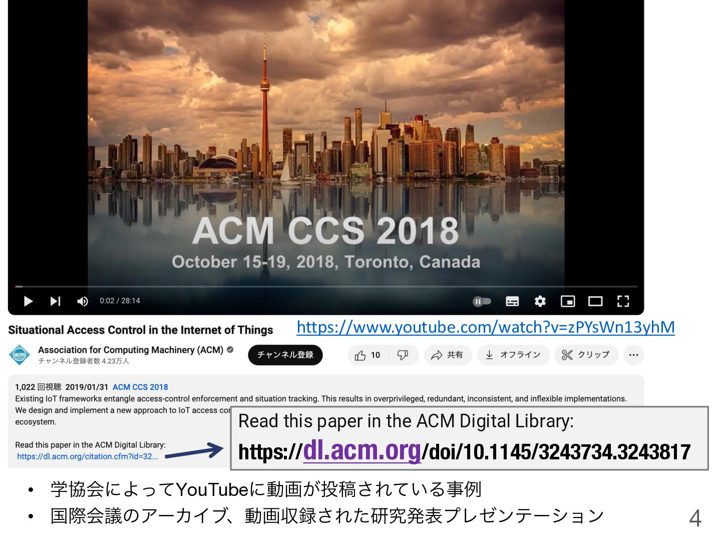 https://www.youtube.com/watch?v=zPYsWn13yhM • ֶڠձʹΑͬͯYouTubeʹಈը͕౤ߘ͞Ε͍ͯΔࣄྫ • ࠃࡍձٞͷΞʔΧΠϒɺಈըऩ࿥͞ΕͨݚڀൃදϓϨθϯςʔγϣϯ