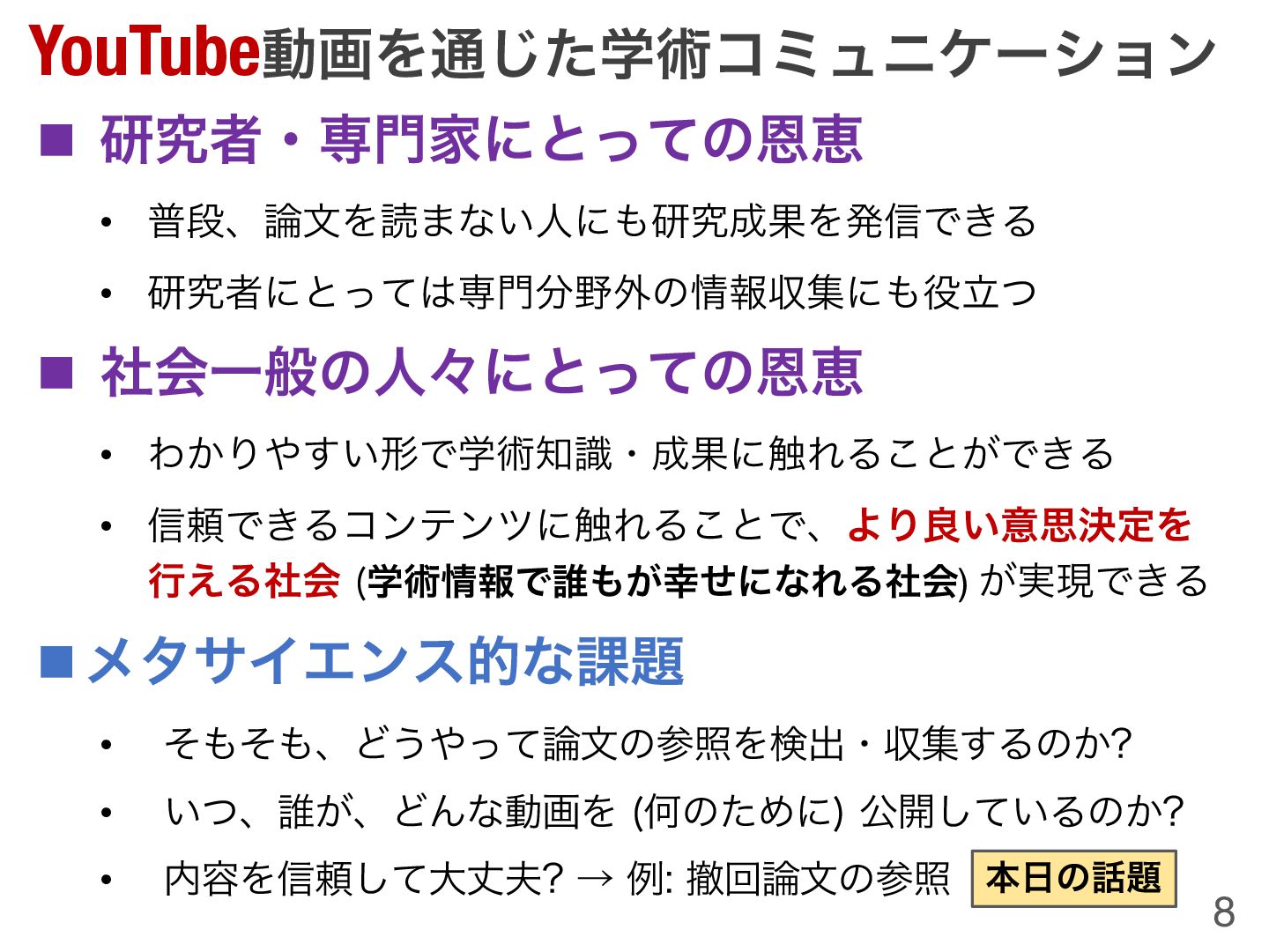 > 「YouTubeにおける『撤回論文』の参照実態:大規模データセットに基づく定量的分析」吉川次郎(和歌山大学)