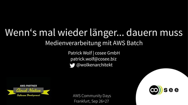 Wenn ich Prozesse habe, die aus vielen, kleinen, am besten unabhängigen Arbeitsschritten bestehen und ich mich um nichts kümmern will, ist AWS Lambda für mich das Mittel der Wahl. Aber es gibt die 5-Minuten-Laufzeitbegrenzung. Was mache ich also, wenn ich Prozesse habe, die regelmäßig länger laufen? Vor diesem Problem stehen wir immer wieder, wenn wir Medien wie Filme oder Hörbücher verarbeiten und absichern müssen. Transkodieren, automatisch Previews erstellen, mit Wasserzeichen absichern, das alles sind Arbeitsschritte, die eng an die Abspielzeit des Mediums geknüpft sind und deswegen gerne über die magische 5-Minuten-Marke geraten. In diesem Talk zeigen wir, wie wir dieses Problem mit AWS Batch gelöst haben, so dass es sich von außen betrachtet kaum von einer echten serverless-Lösung unterscheidet. Batch erlaubt uns die Verarbeitung in Einzelschritten abzuhandeln, einfach Abhängigkeiten zwischen diesen Einzelschritten zu definieren und stellt selbstständig sicher, dass einmal angestoßen die ganze Verarbeitungskette durchläuft. Es bleibt allerdings an uns, den Überblick über die angestoßenen Prozesse zu behalten. Dann aber bietet Batch nicht nur die für dieses Szenario nötige Compute-Power, sondern das auch noch zu einem günstigeren Preis als er in Lambda möglich wäre.