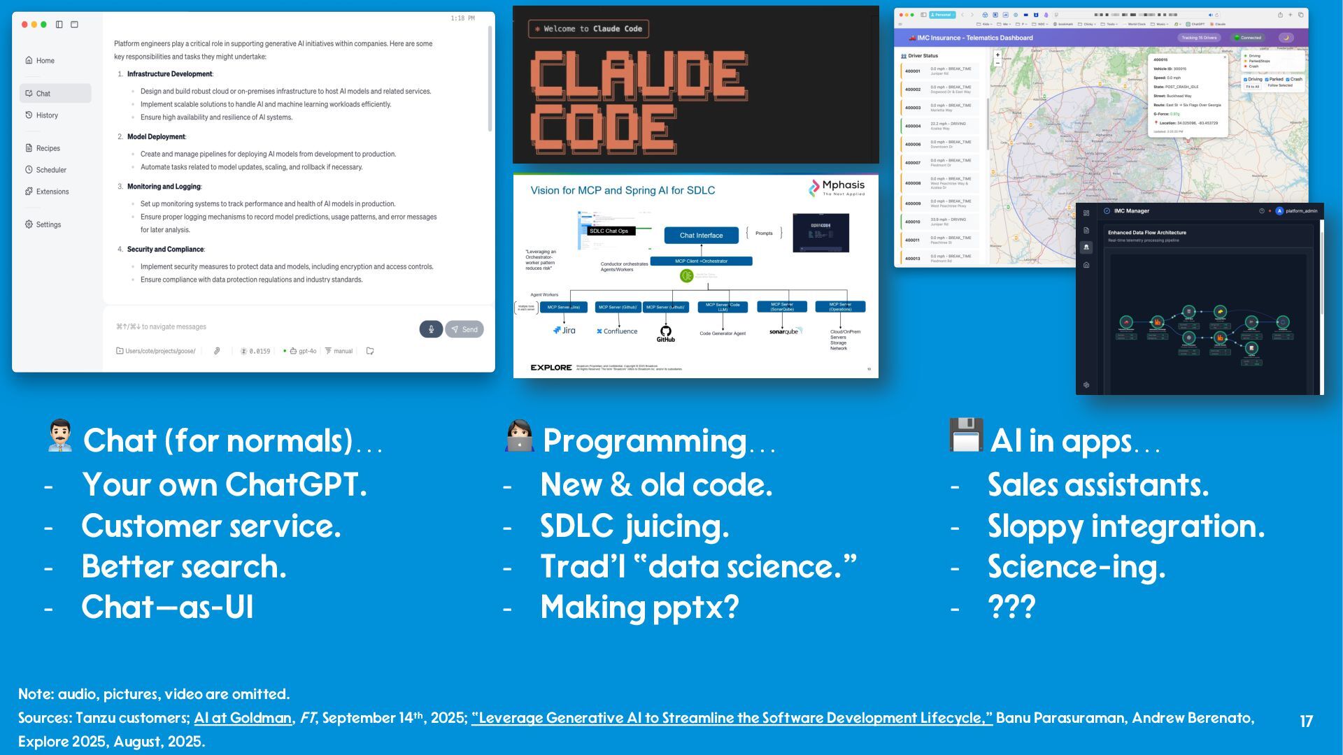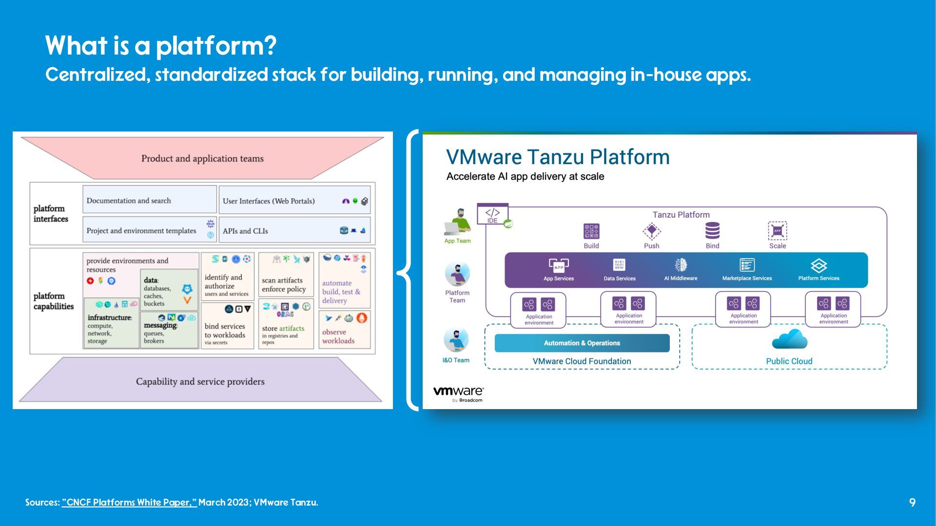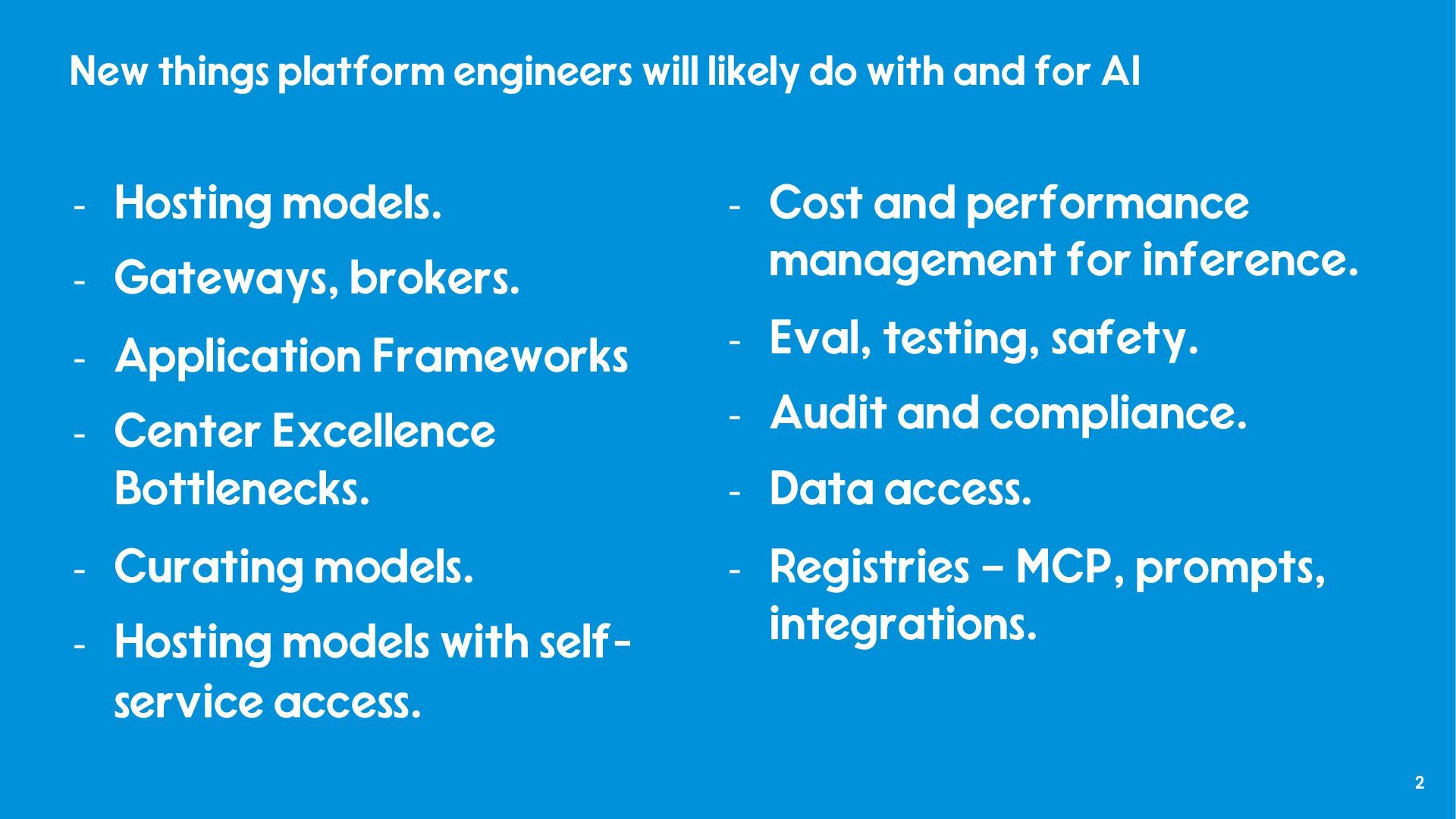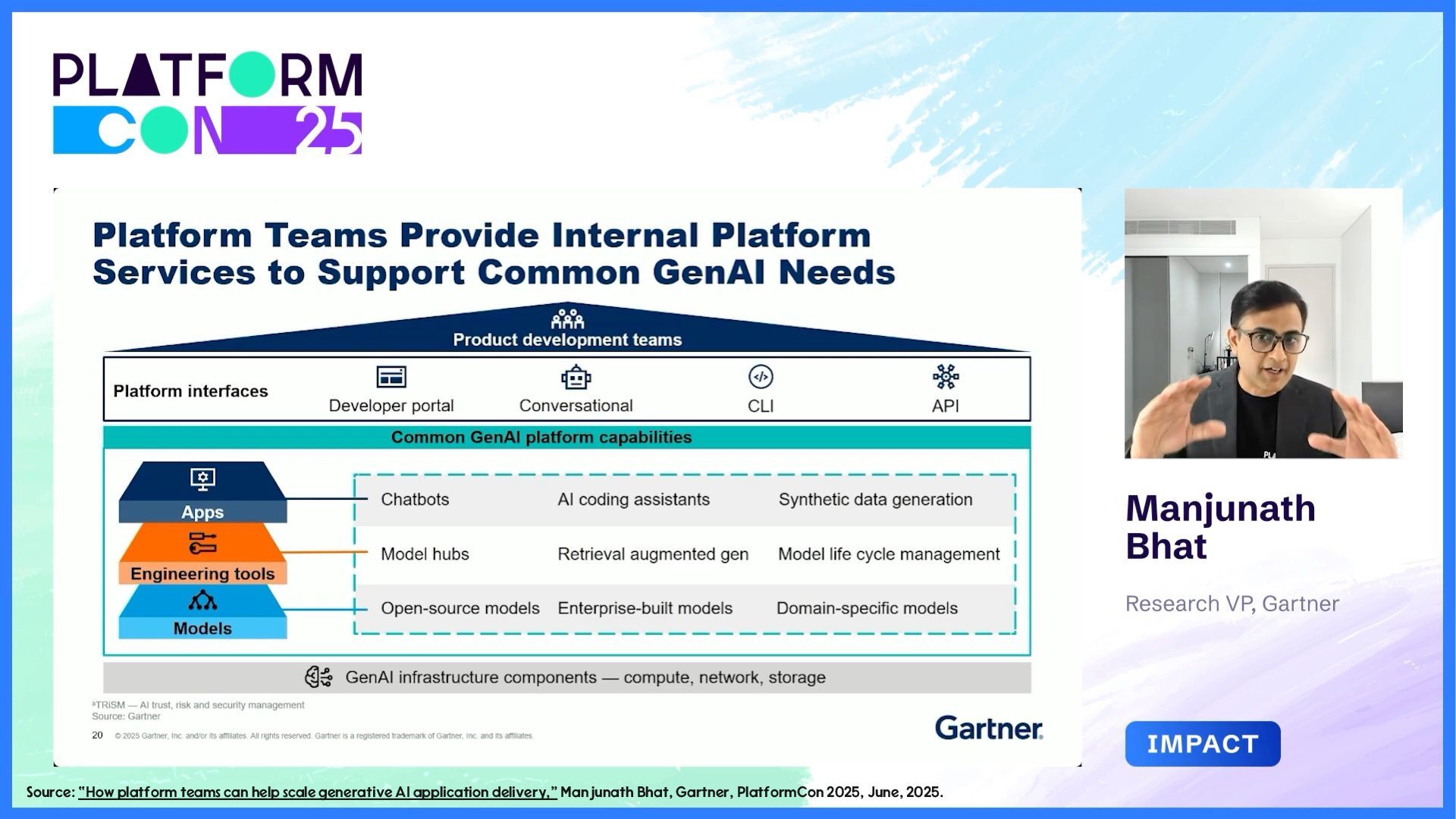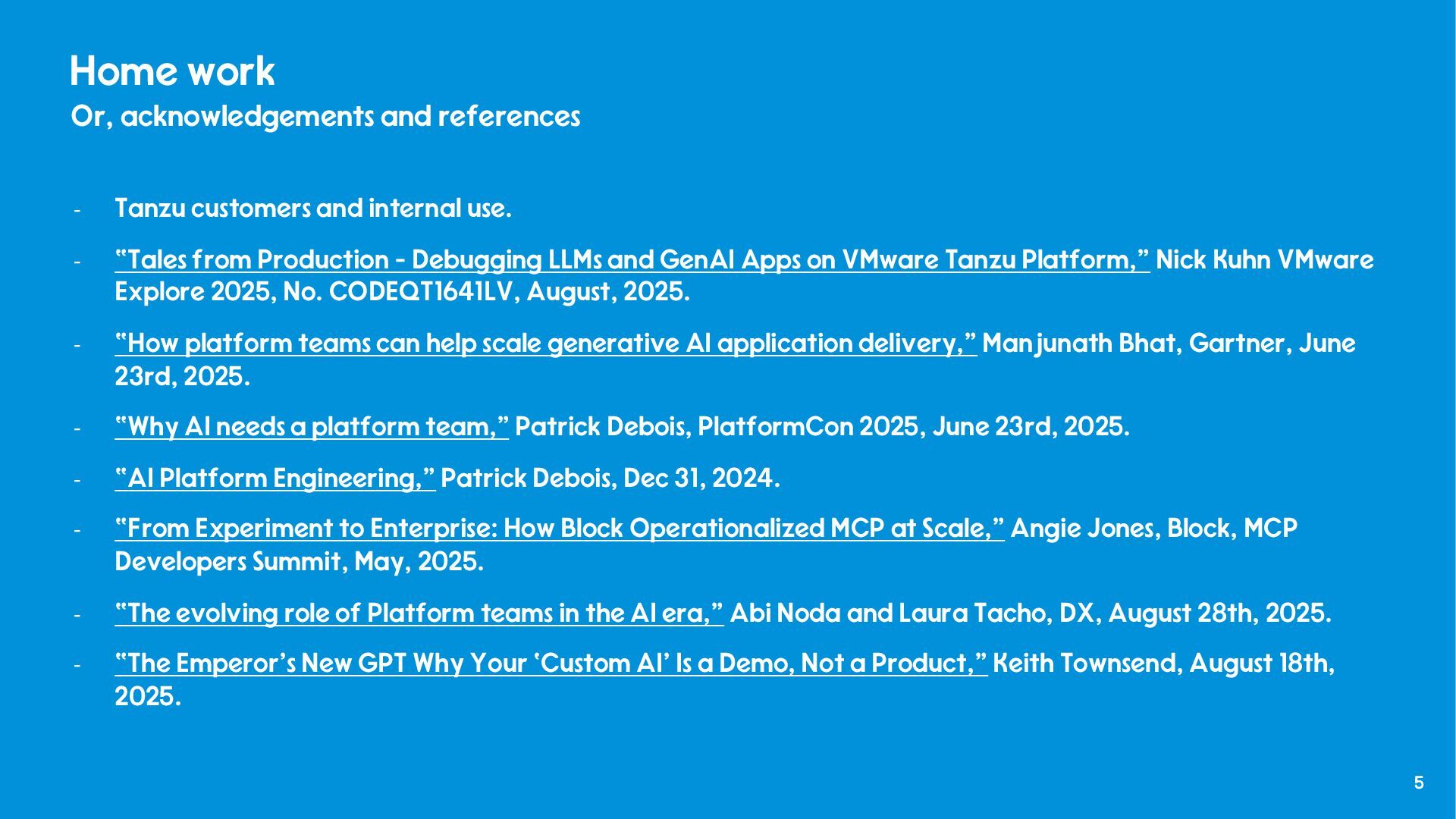 and internal use. - “Tales from Production - Debugging LLMs and GenAI Apps on VMware Tanzu Platform,” Nick Kuhn VMware Explore 2025, No. CODEQT1641LV, August, 2025. - “How platform teams can help scale generative AI application delivery,” Manjunath Bhat, Gartner, June 23rd, 2025. - “Why AI needs a platform team,” Patrick Debois, PlatformCon 2025, June 23rd, 2025. - “AI Platform Engineering,” Patrick Debois, Dec 31, 2024. - “From Experiment to Enterprise: How Block Operationalized MCP at Scale,” Angie Jones, Block, MCP Developers Summit, May, 2025. - “The evolving role of Platform teams in the AI era,” Abi Noda and Laura Tacho, DX, August 28th, 2025. - “The Emperor’s New GPT Why Your ‘Custom AI’ Is a Demo, Not a Product,” Keith Townsend, August 18th, 2025.