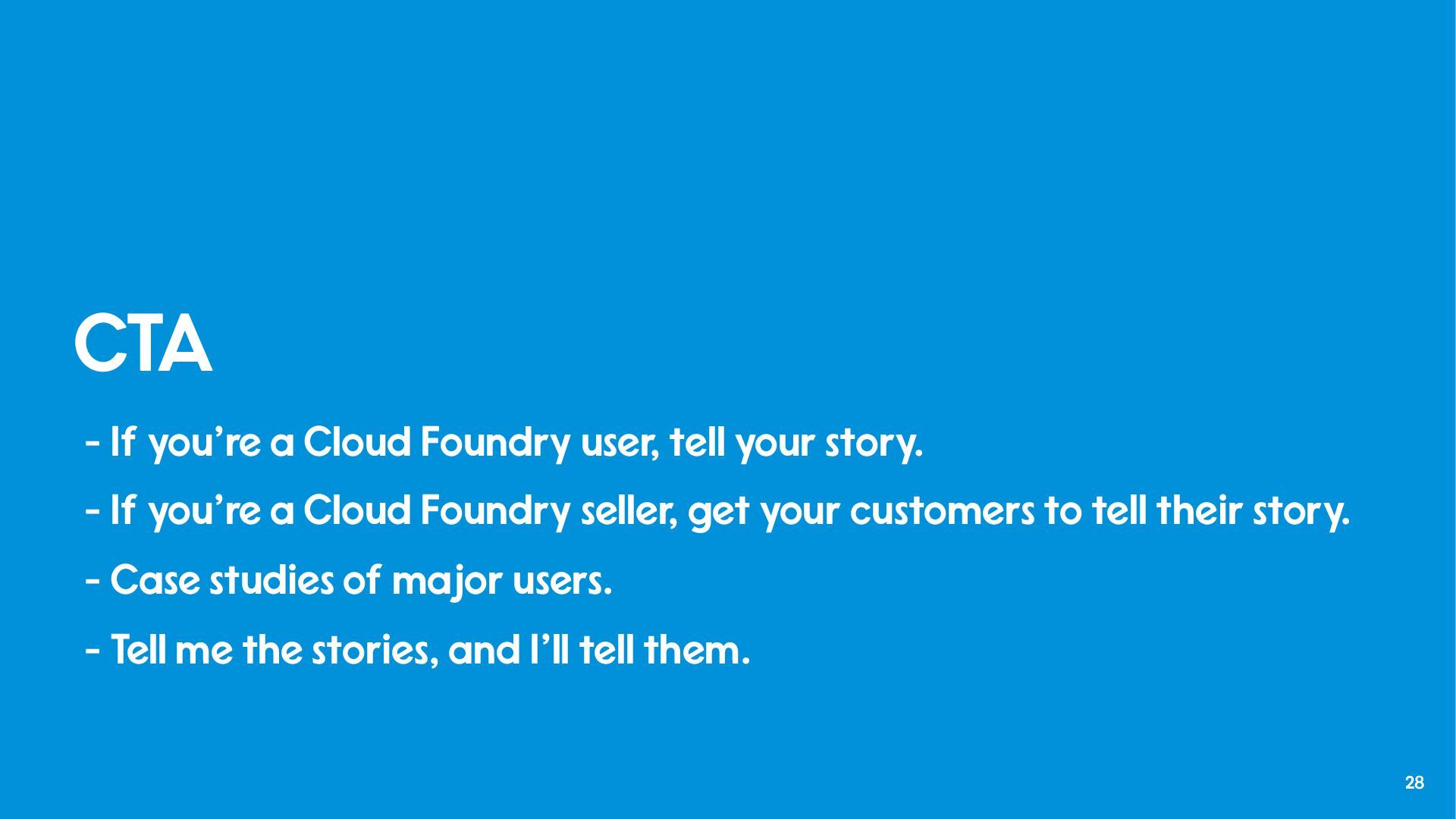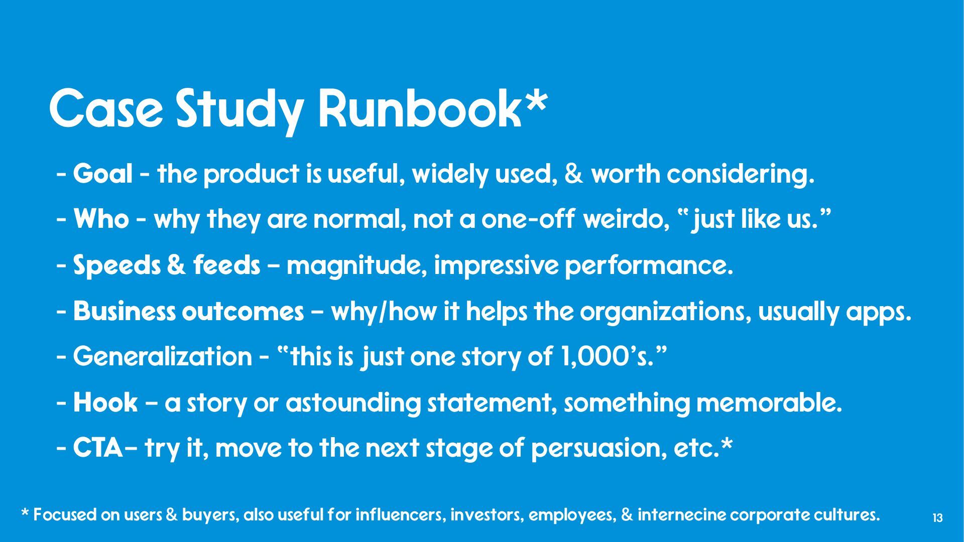 useful, widely used, & worth considering. - Who - why they are normal, not a one-off weirdo, “just like us.” - Speeds & feeds – magnitude, impressive performance. - Business outcomes – why/how it helps the organizations, usually apps. - Generalization - “this is just one story of 1,000’s.” - Hook – a story or astounding statement, something memorable. - CTA– try it, move to the next stage of persuasion, etc.* * Focused on users & buyers, also useful for influencers, investors, employees, & internecine corporate cultures.