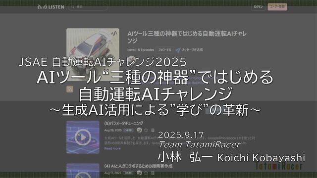 自動車技術会 自動運転AIチャレンジ予選表彰式 https://www.jsae.or.jp/jaaic2025/overview/ https://www.youtube.com/watch?v=z3pqjLJnENo