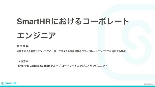 CONFIDENTIAL SmartHRʹ͓͚ΔίʔϙϨʔτ ΤϯδχΞ 2022.02.16 اۀΛࢧ͑Δ৽࣌ΤϯδχΞͷࣄɹϓϩμΫτ։ൃܦݧऀ͕ίʔϙϨʔτΤϯδχΞʹઓ͢Δཧ༝ େ༸ฏ SmartHR General Support άϧʔϓ