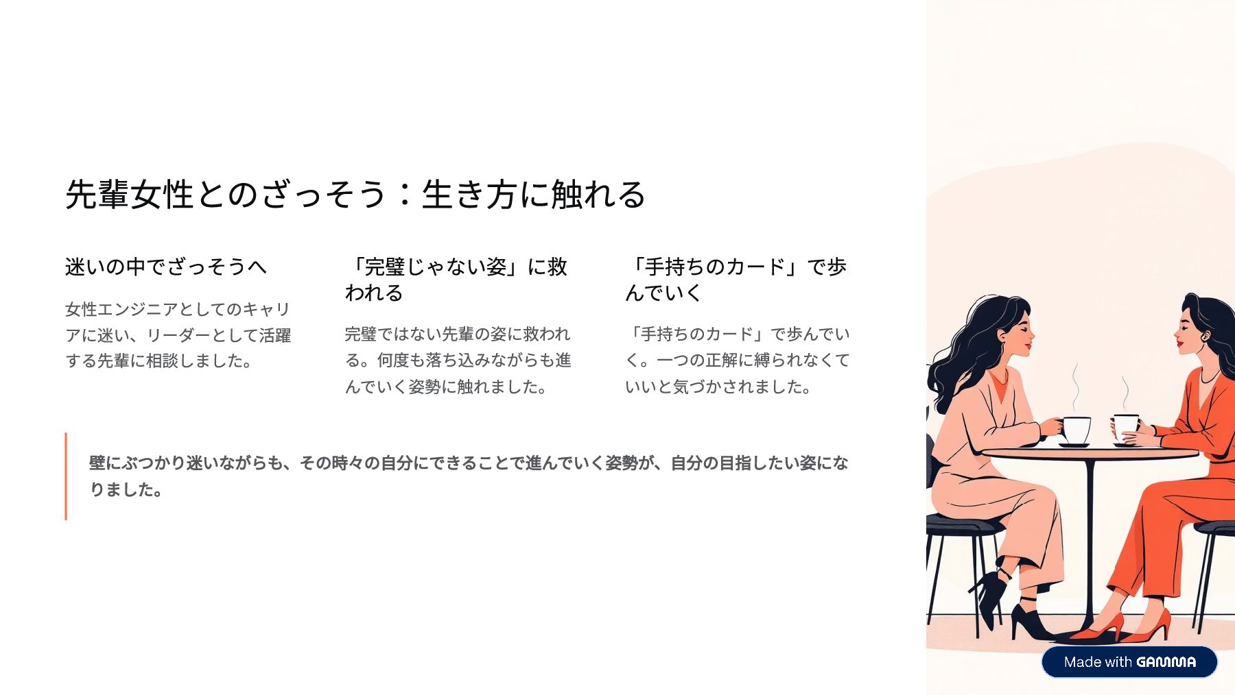 1. 先輩⼥性xのざっそう:⽣き⽅{触¼» 迷いの中wざっそうへ ⼥性エンジニアxしv~キャリ ア{迷い1リーダーxしv活躍 す»先輩{相談し~した2 <完璧じゃzい姿={救 わ¼» 完璧wzい先輩~姿{救わ¼ »2何度も落ち込z|らも進 んwいく姿勢{触¼~した2