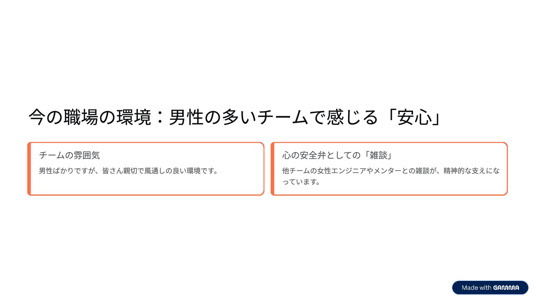 ・ 男性の多いチームでも、女性エンジニアやメンターさんと楽しく雑談して解消される不安