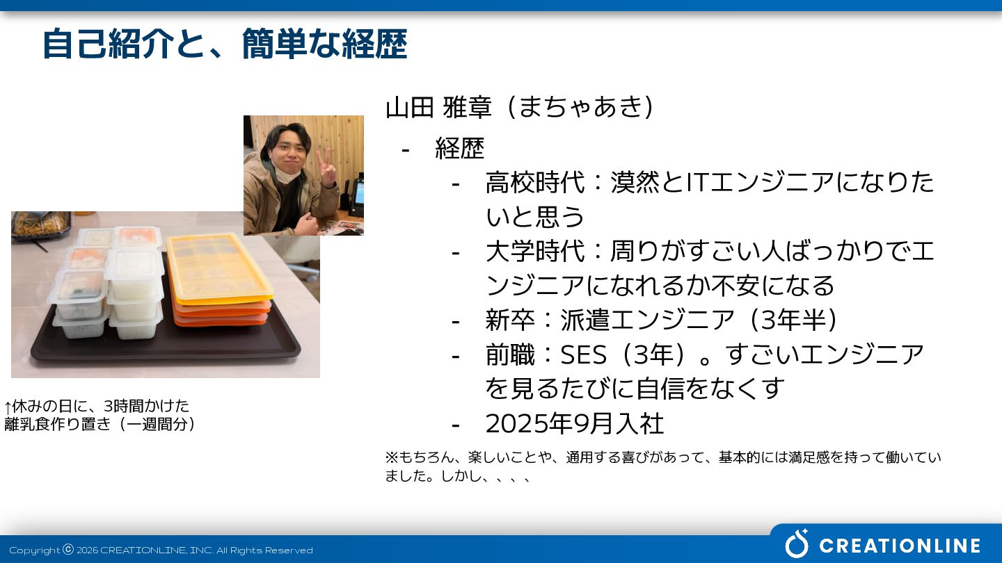 昨年9月にクリエーションラインへ入社し、AI駆動開発やAWSを学びながら、フルスタックエンジニアへの道を歩み出した。新米パパ。