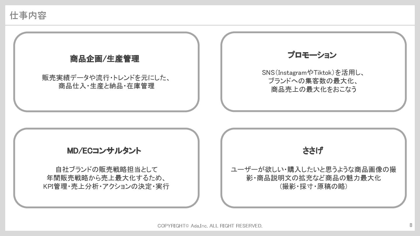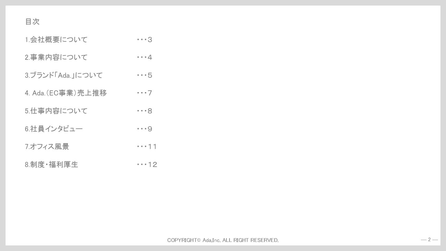 4. Ada.(EC事業)売上推移 ・・・7 5.仕事内容について ・・・8 6.社員インタビュー ・・・9 7.オフィス風景 ・・・11 8.制度・福利厚生 ・・・12 COPYRIGHT© Ada,Inc. ALL RIGHT RESERVED. ― 2 ―