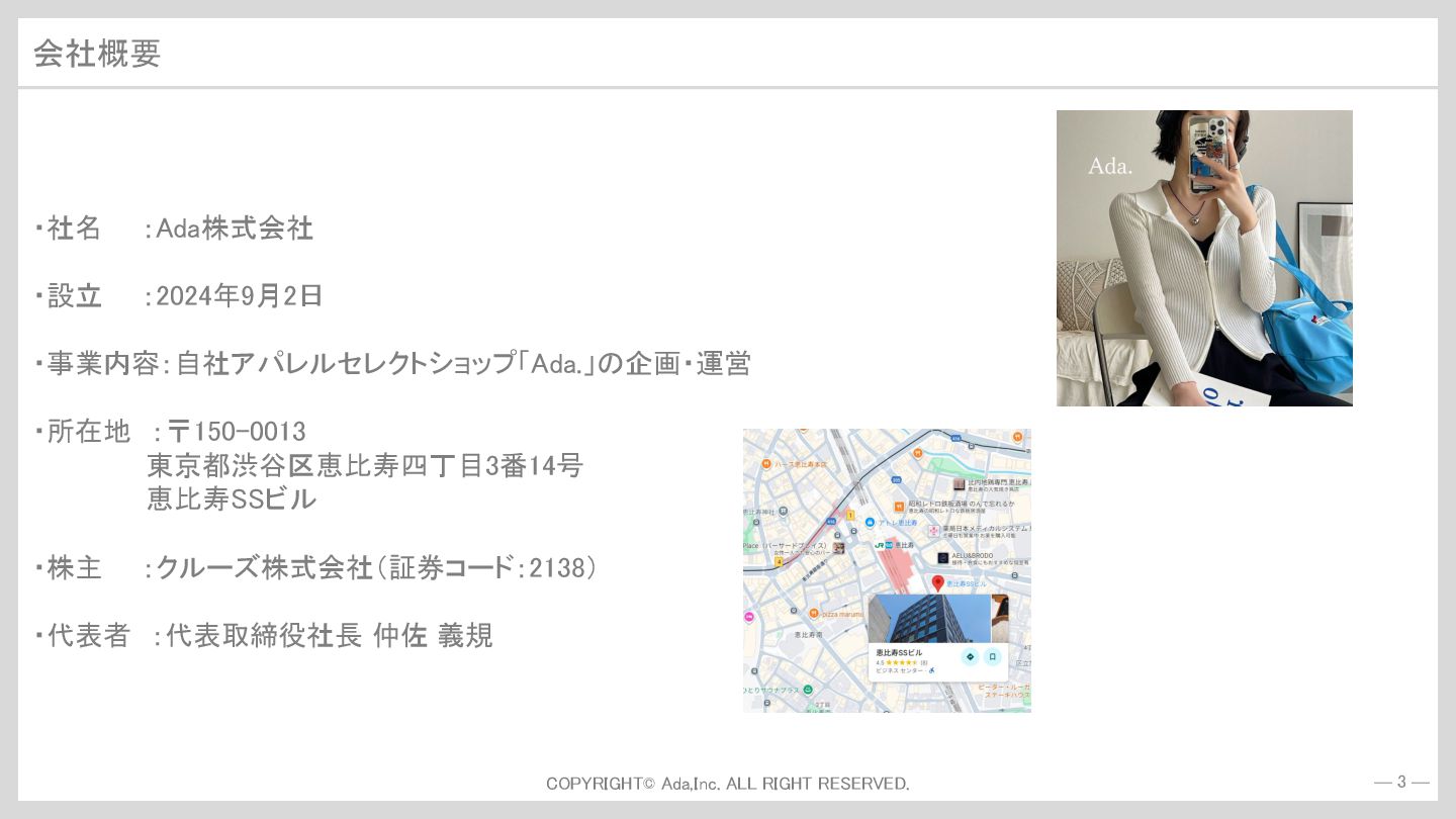 ・所在地 :〒150-0013 東京都渋谷区恵比寿四丁目3番14号 恵比寿SSビル ・株主 :クルーズ株式会社(証券コード:2138) ・代表者 :代表取締役社長 仲佐 義規 COPYRIGHT© Ada,Inc. ALL RIGHT RESERVED. ― 3 ―