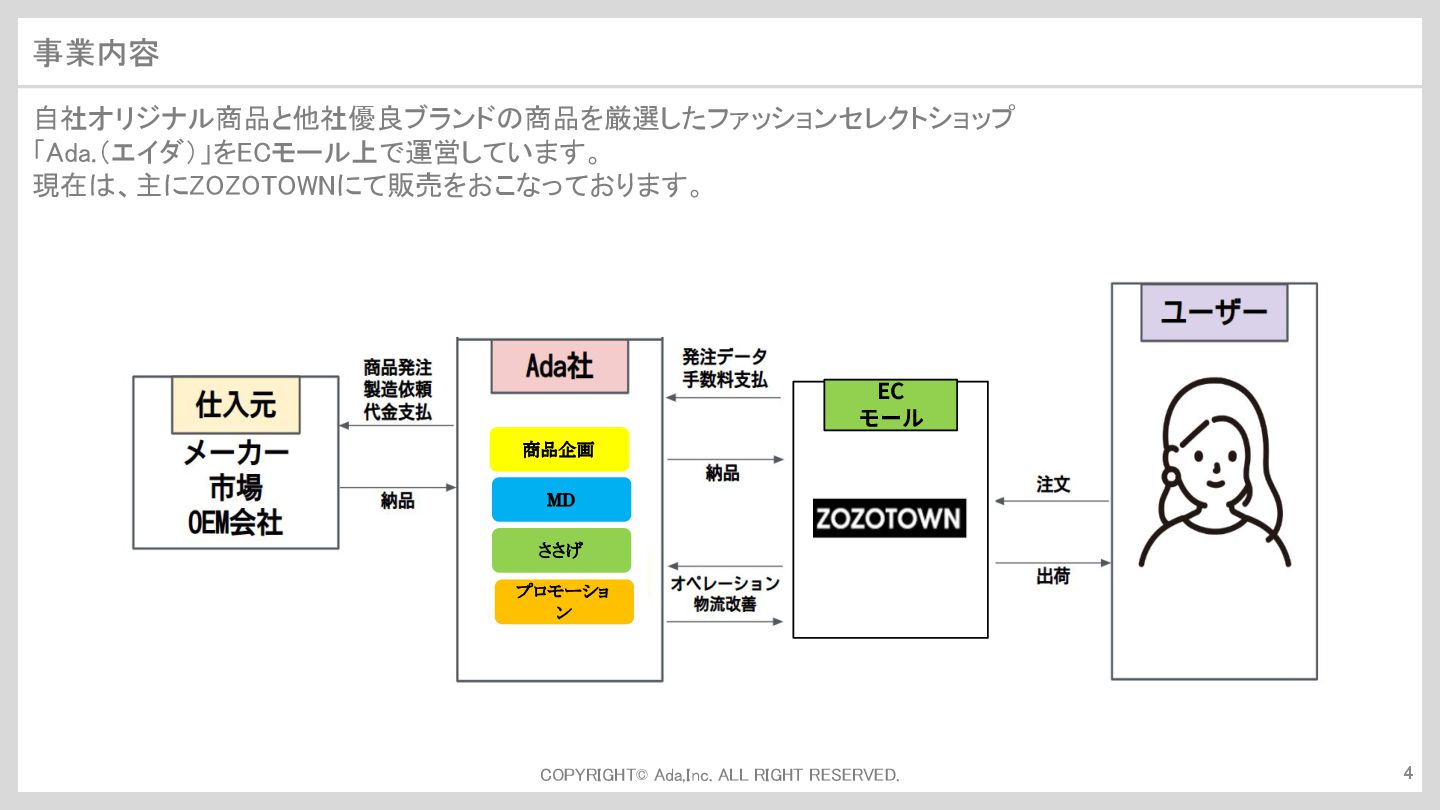 事業内容 自社オリジナル商品と他社優良ブランドの商品を厳選したファッションセレクトショップ 「Ada.(エイダ)」をECモール上で運営しています。 現在は、主にZOZOTOWNにて販売をおこなっております。 COPYRIGHT© Ada,Inc. ALL RIGHT