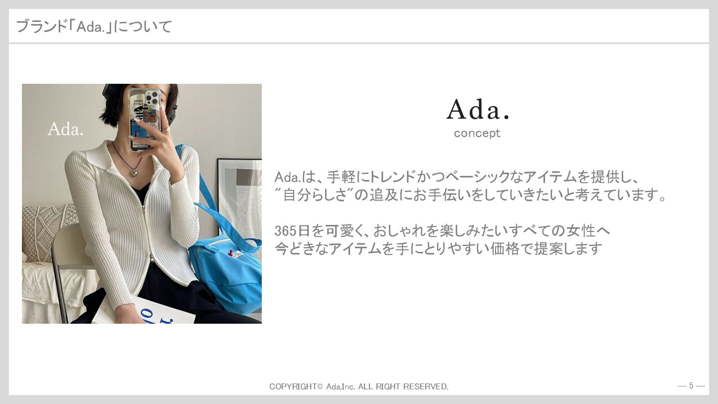 COPYRIGHT© Ada,Inc. ALL RIGHT RESERVED. ― 5 ― concept Ada.は、手軽にトレンドかつベーシックなアイテムを提供し、