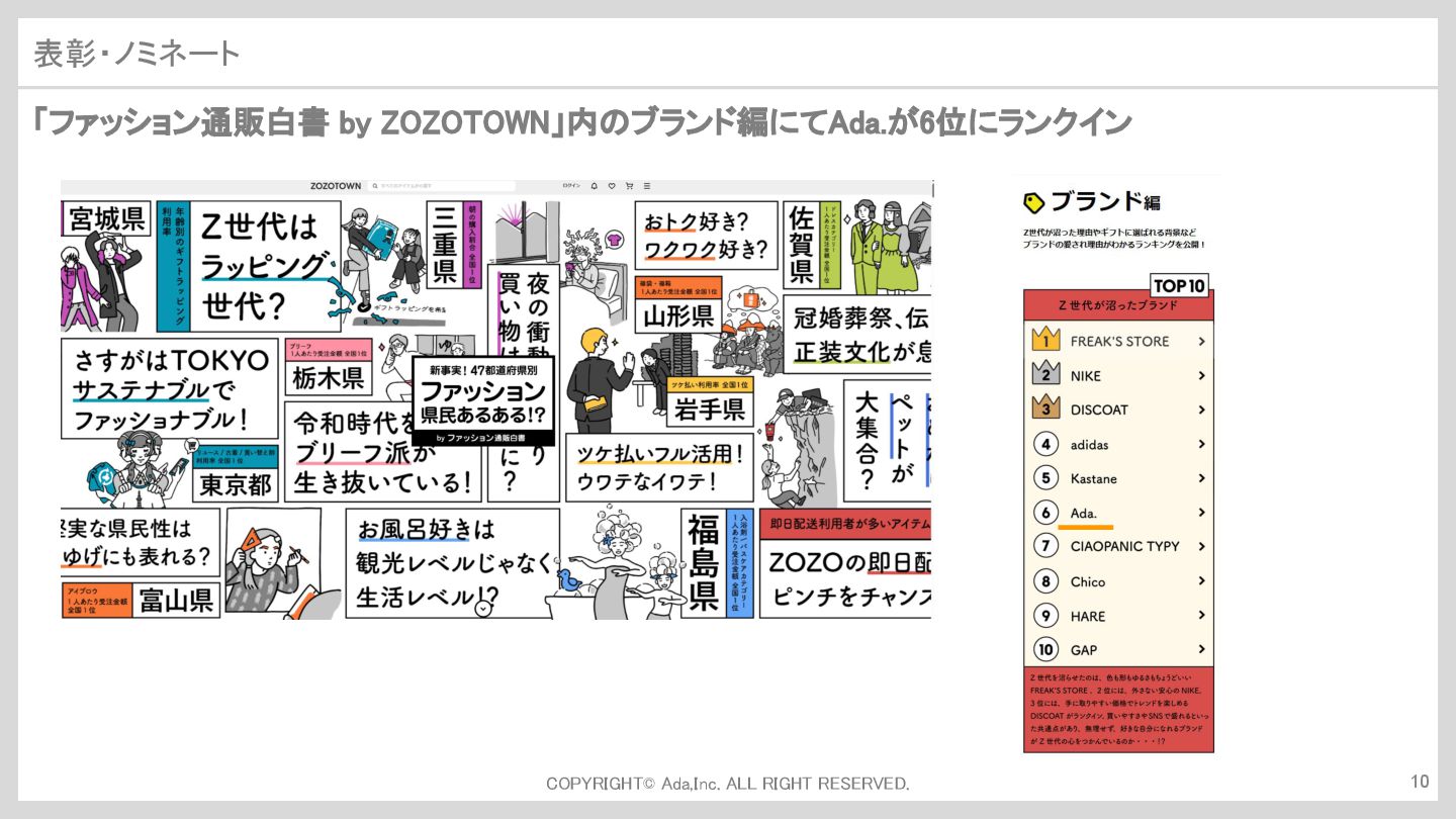 表彰・ノミネート 「ファッション通販白書 by ZOZOTOWN」内のブランド編にてAda.が6位にランクイン 10 COPYRIGHT© Ada,Inc. ALL RIGHT