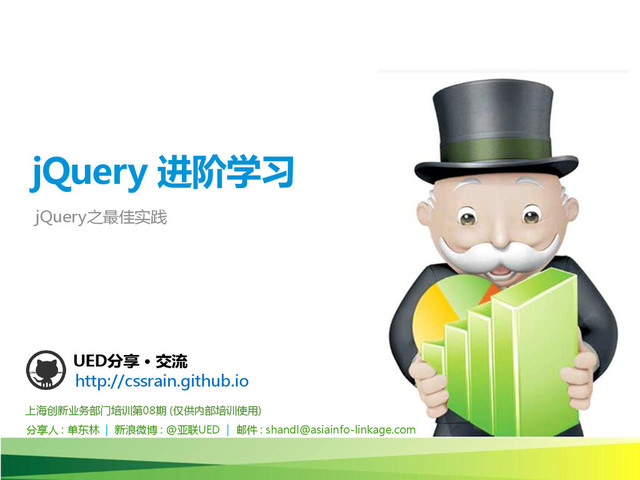 邮件 : [email protected] 上海创新业务部门培训第08期 (仅供内部培训使用) jQuery乊最佳实践 UED分享 · 交流 http://cssrain.github.io