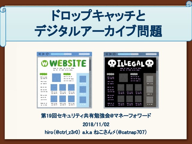 観光サイト オークション中 内閣府 2017.12.22 cyber3conf-okinawa2015.jp Cyber3 Conference Okinawa 2015 アダルトサイト 内閣府 2018.05.09 sip-cao.jp SIP ※ 風俗サイト 岐阜県羽島市 2018.06.08 arigato-hashima.com ふるさと納税サイト アダルトサイト 地方公共団体 情報システム機構 2018.07.21 lascdec.or.jp 地方自治情報センター (2014年4月からJ-LIS) 一時凍結 NHKエンタープライズ 2018.10.15 nhk-grp.jp NHKグループ オークション中 さいたま市 2018.10.31 world-bonsai-saitama.jp 世界盆栽大会 in さいたま アダルトサイト ※戦略的イノベーション創造プログラム ▪ドロップキャッチされると何がダメなのか ・利用者は、以前の信頼されたサイトだと思ってアクセスしてくる ・フィッシングサイトに悪用されたり、マルウェア感染狙いも