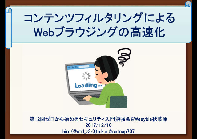 コンテンツフィルタリングによる Webブラウジングの高速化 第12回ゼロから始めるセキュリティ入門勉強会@Weeyble秋葉原 2017/12/10 hiro(@ctrl_z3r0)a.k.a @catnap707