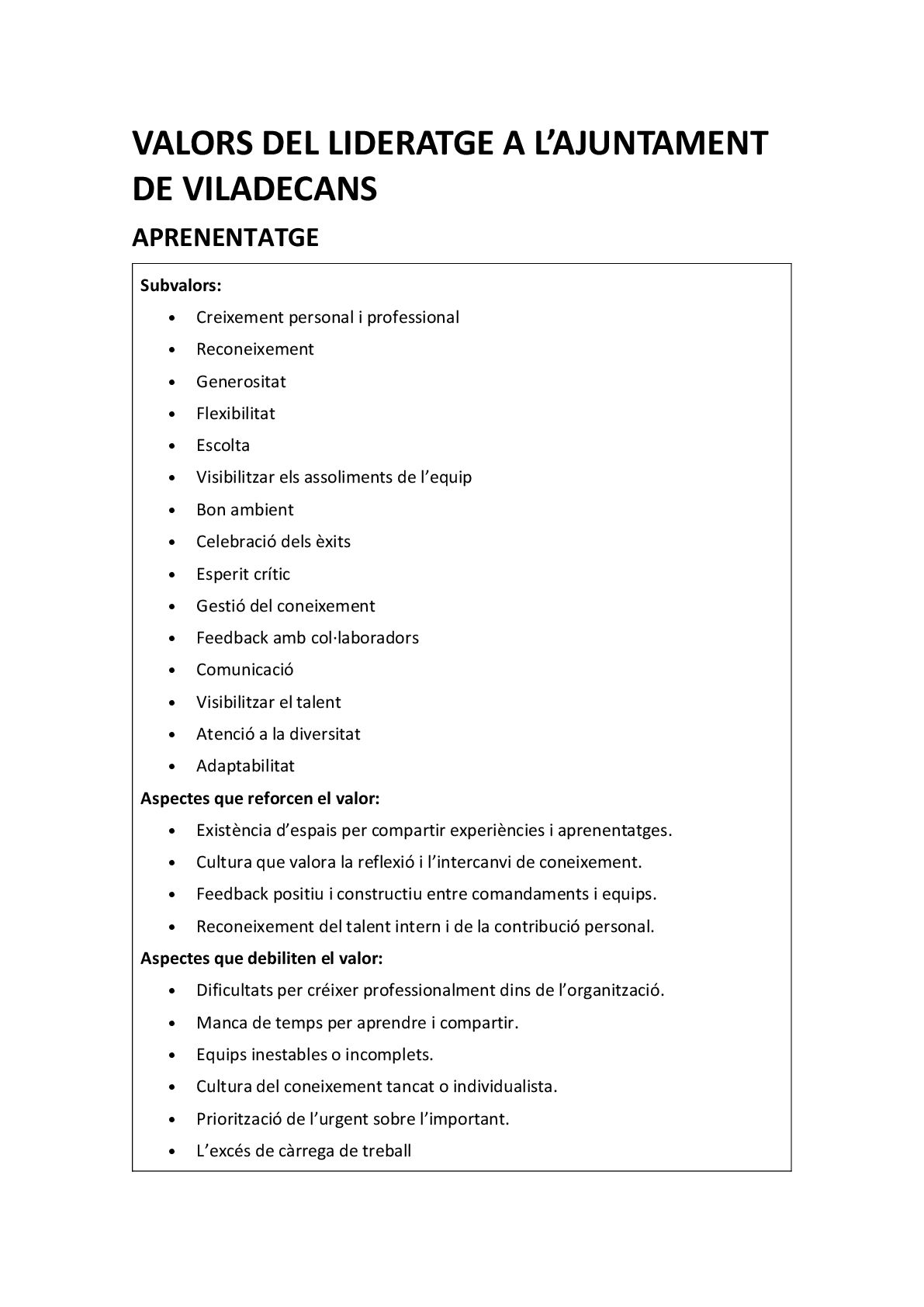1. VALORS DEL LIDERATGE A L’AJUNTAMENT DE VILADECANS APRENENTATGE Subvalors: •