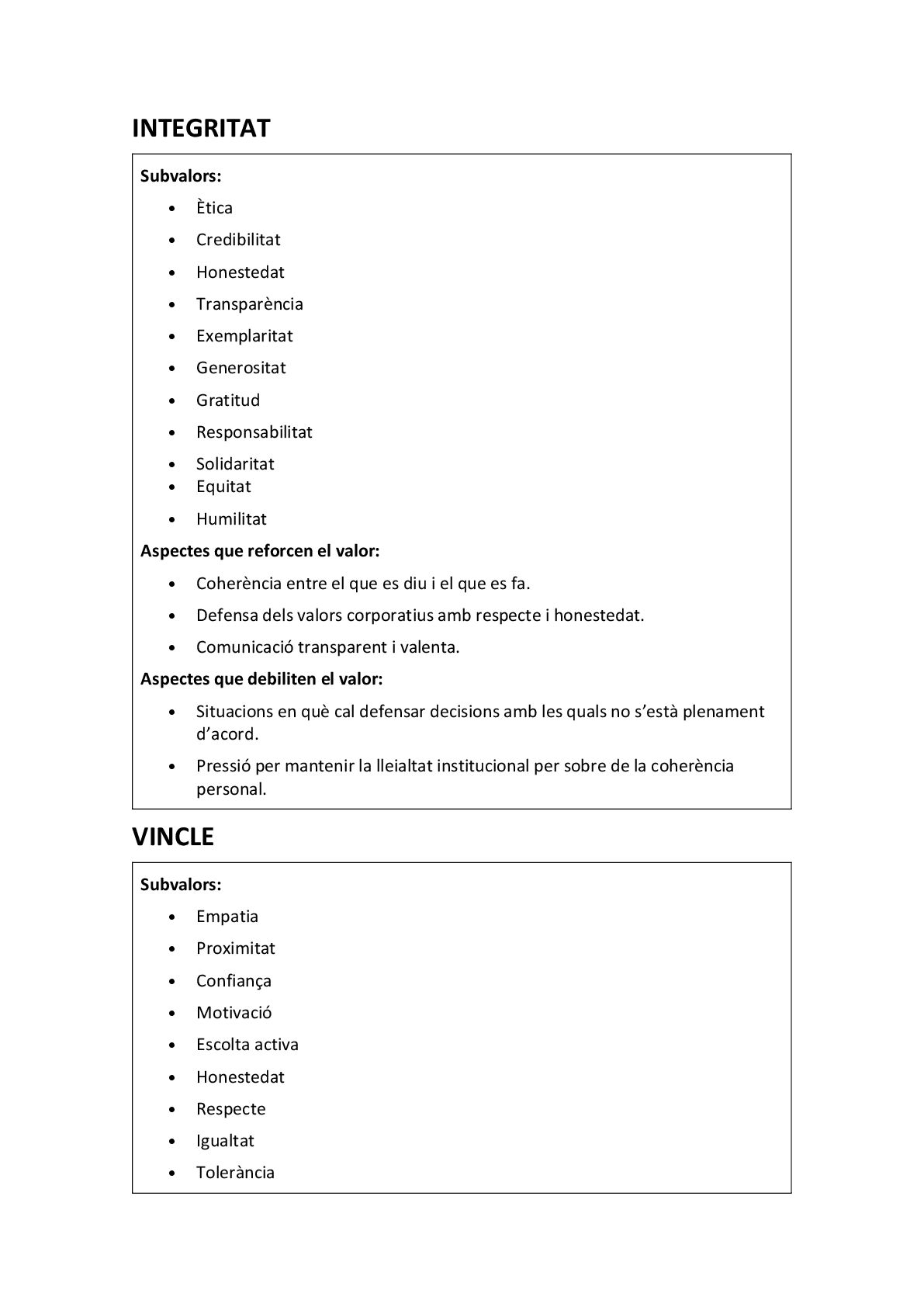 • Exemplaritat • Generositat • Gratitud • Responsabilitat • Solidaritat • Equitat • Humilitat Aspectes que reforcen el valor: • Coherència entre el que es diu i el que es fa. • Defensa dels valors corporatius amb respecte i honestedat. • Comunicació transparent i valenta. Aspectes que debiliten el valor: • Situacions en què cal defensar decisions amb les quals no s’està plenament d’acord. • Pressió per mantenir la lleialtat institucional per sobre de la coherència personal. VINCLE Subvalors: • Empatia • Proximitat • Confiança • Motivació • Escolta activa • Honestedat • Respecte • Igualtat • Tolerància