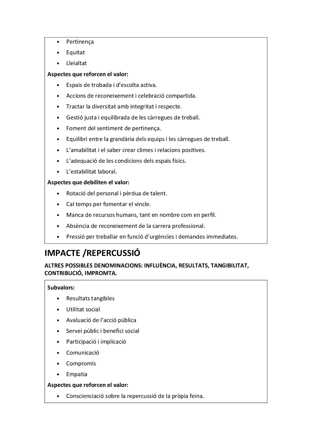valor: • Espais de trobada i d’escolta activa. • Accions de reconeixement i celebració compartida. • Tractar la diversitat amb integritat i respecte. • Gestió justa i equilibrada de les càrregues de treball. • Foment del sentiment de pertinença. • Equilibri entre la grandària dels equips i les càrregues de treball. • L’amabilitat i el saber crear climes i relacions positives. • L’adequació de les condicions dels espais físics. • L’estabilitat laboral. Aspectes que debiliten el valor: • Rotació del personal i pèrdua de talent. • Cal temps per fomentar el vincle. • Manca de recursos humans, tant en nombre com en perfil. • Absència de reconeixement de la carrera professional. • Pressió per treballar en funció d’urgències i demandes immediates. IMPACTE /REPERCUSSIÓ ALTRES POSSIBLES DENOMINACIONS: INFLUÈNCIA, RESULTATS, TANGIBILITAT, CONTRIBUCIÓ, IMPROMTA. Subvalors: • Resultats tangibles • Utilitat social • Avaluació de l’acció pública • Servei públic i benefici social • Participació i implicació • Comunicació • Compromís • Empatia Aspectes que reforcen el valor: • Conscienciació sobre la repercussió de la pròpia feina.