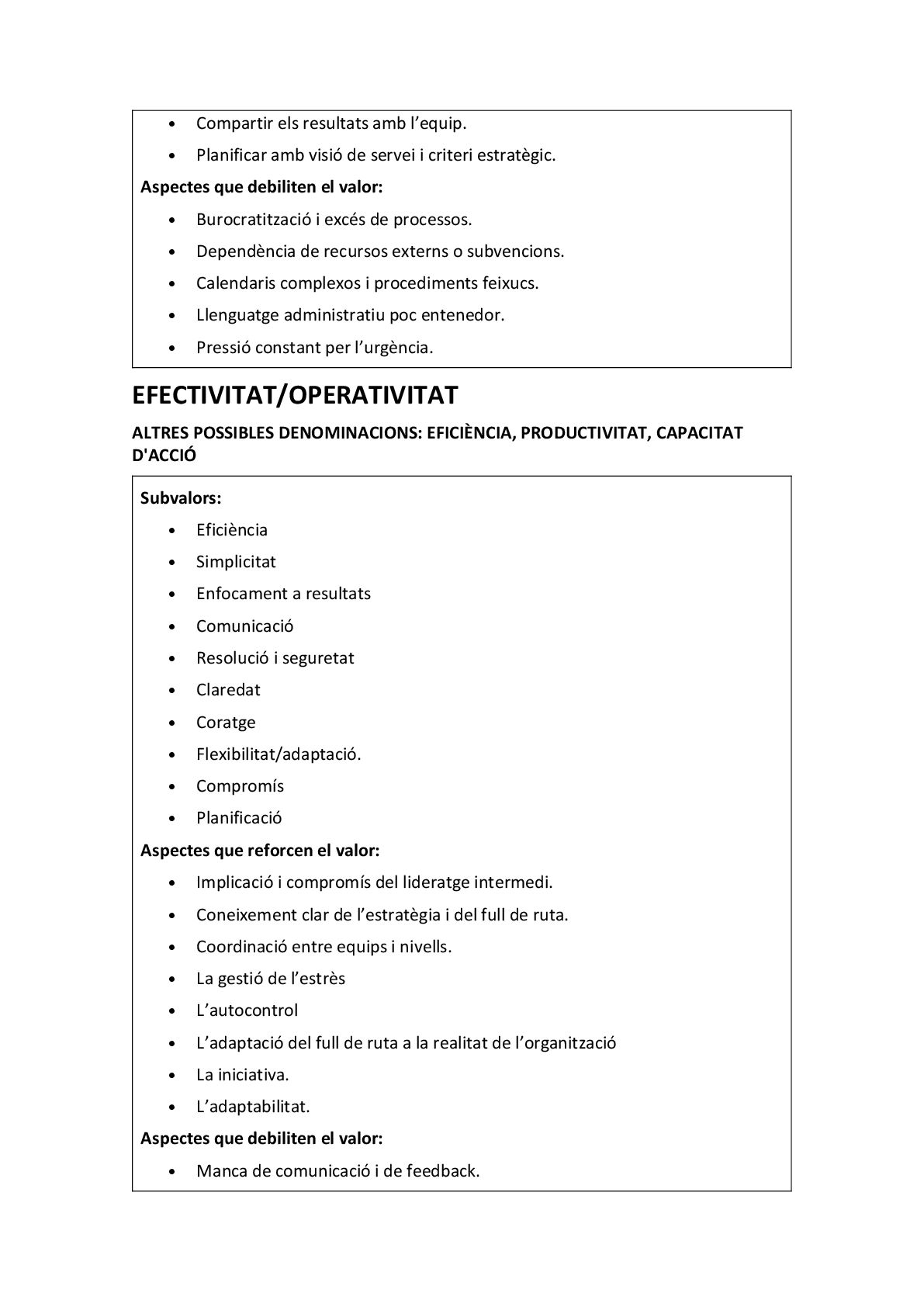 de servei i criteri estratègic. Aspectes que debiliten el valor: • Burocratització i excés de processos. • Dependència de recursos externs o subvencions. • Calendaris complexos i procediments feixucs. • Llenguatge administratiu poc entenedor. • Pressió constant per l’urgència. EFECTIVITAT/OPERATIVITAT ALTRES POSSIBLES DENOMINACIONS: EFICIÈNCIA, PRODUCTIVITAT, CAPACITAT D'ACCIÓ Subvalors: • Eficiència • Simplicitat • Enfocament a resultats • Comunicació • Resolució i seguretat • Claredat • Coratge • Flexibilitat/adaptació. • Compromís • Planificació Aspectes que reforcen el valor: • Implicació i compromís del lideratge intermedi. • Coneixement clar de l’estratègia i del full de ruta. • Coordinació entre equips i nivells. • La gestió de l’estrès • L’autocontrol • L’adaptació del full de ruta a la realitat de l’organització • La iniciativa. • L’adaptabilitat. Aspectes que debiliten el valor: • Manca de comunicació i de feedback.