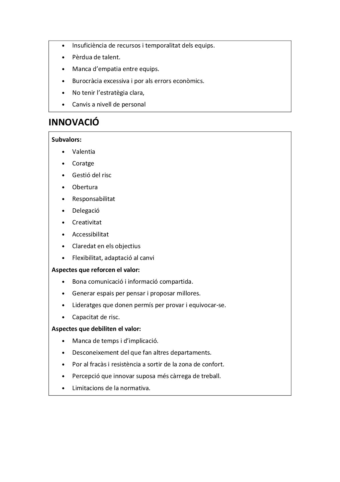 de talent. • Manca d’empatia entre equips. • Burocràcia excessiva i por als errors econòmics. • No tenir l’estratègia clara, • Canvis a nivell de personal INNOVACIÓ Subvalors: • Valentia • Coratge • Gestió del risc • Obertura • Responsabilitat • Delegació • Creativitat • Accessibilitat • Claredat en els objectius • Flexibilitat, adaptació al canvi Aspectes que reforcen el valor: • Bona comunicació i informació compartida. • Generar espais per pensar i proposar millores. • Lideratges que donen permís per provar i equivocar-se. • Capacitat de risc. Aspectes que debiliten el valor: • Manca de temps i d’implicació. • Desconeixement del que fan altres departaments. • Por al fracàs i resistència a sortir de la zona de confort. • Percepció que innovar suposa més càrrega de treball. • Limitacions de la normativa.
