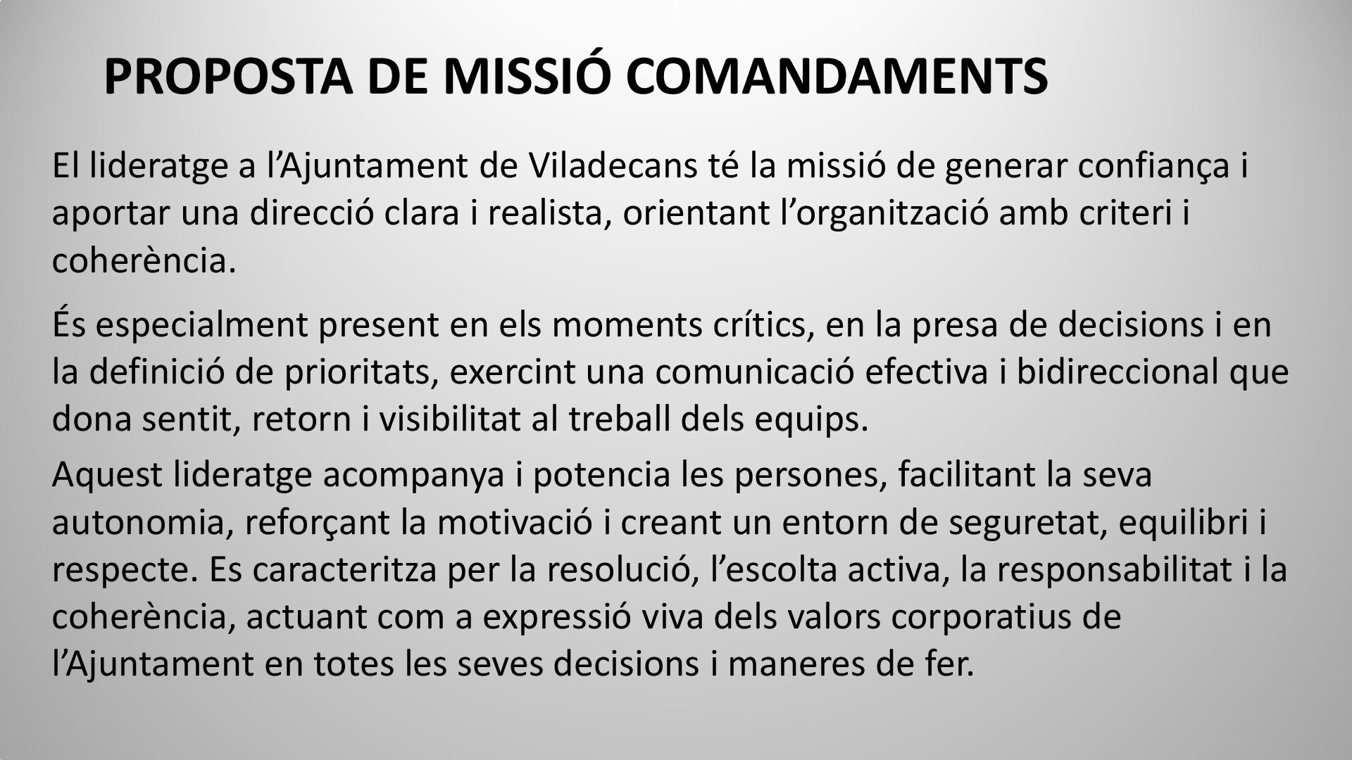té la missió de generar confiança i aportar una direcció clara i realista, orientant l’organització amb criteri i coherència. És especialment present en els moments crítics, en la presa de decisions i en la definició de prioritats, exercint una comunicació efectiva i bidireccional que dona sentit, retorn i visibilitat al treball dels equips. Aquest lideratge acompanya i potencia les persones, facilitant la seva autonomia, reforçant la motivació i creant un entorn de seguretat, equilibri i respecte. Es caracteritza per la resolució, l’escolta activa, la responsabilitat i la coherència, actuant com a expressió viva dels valors corporatius de l’Ajuntament en totes les seves decisions i maneres de fer.