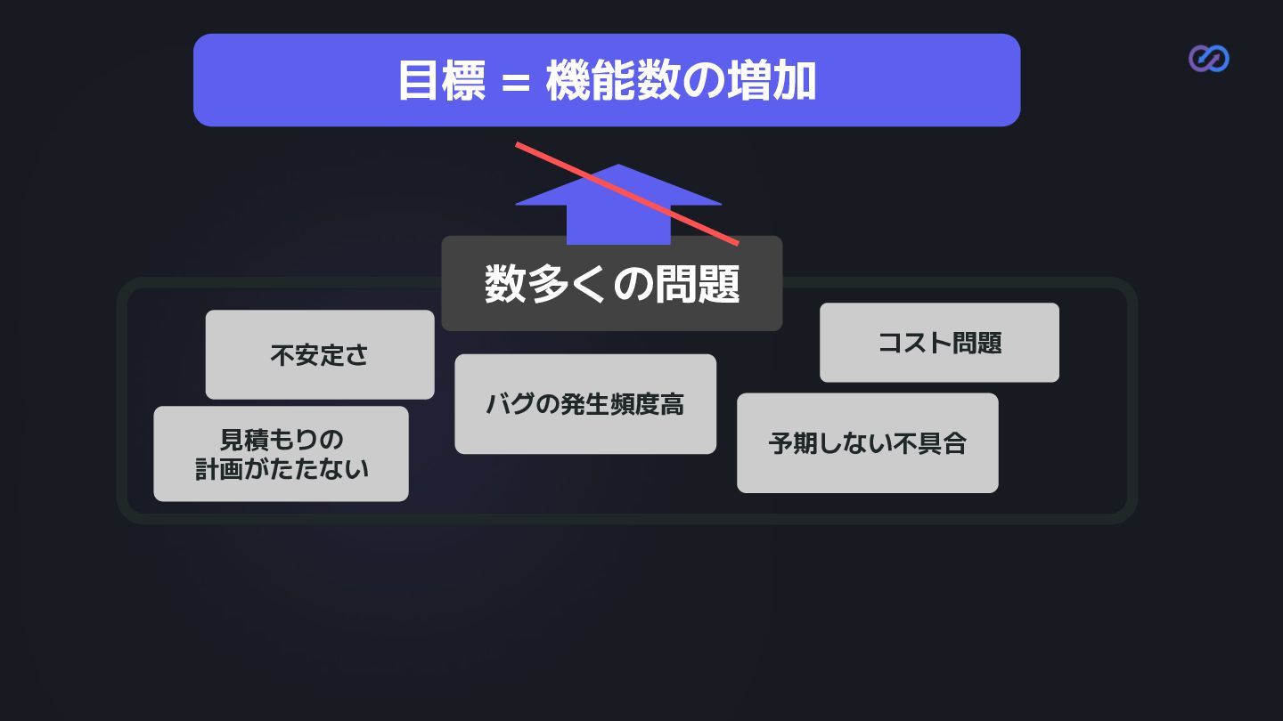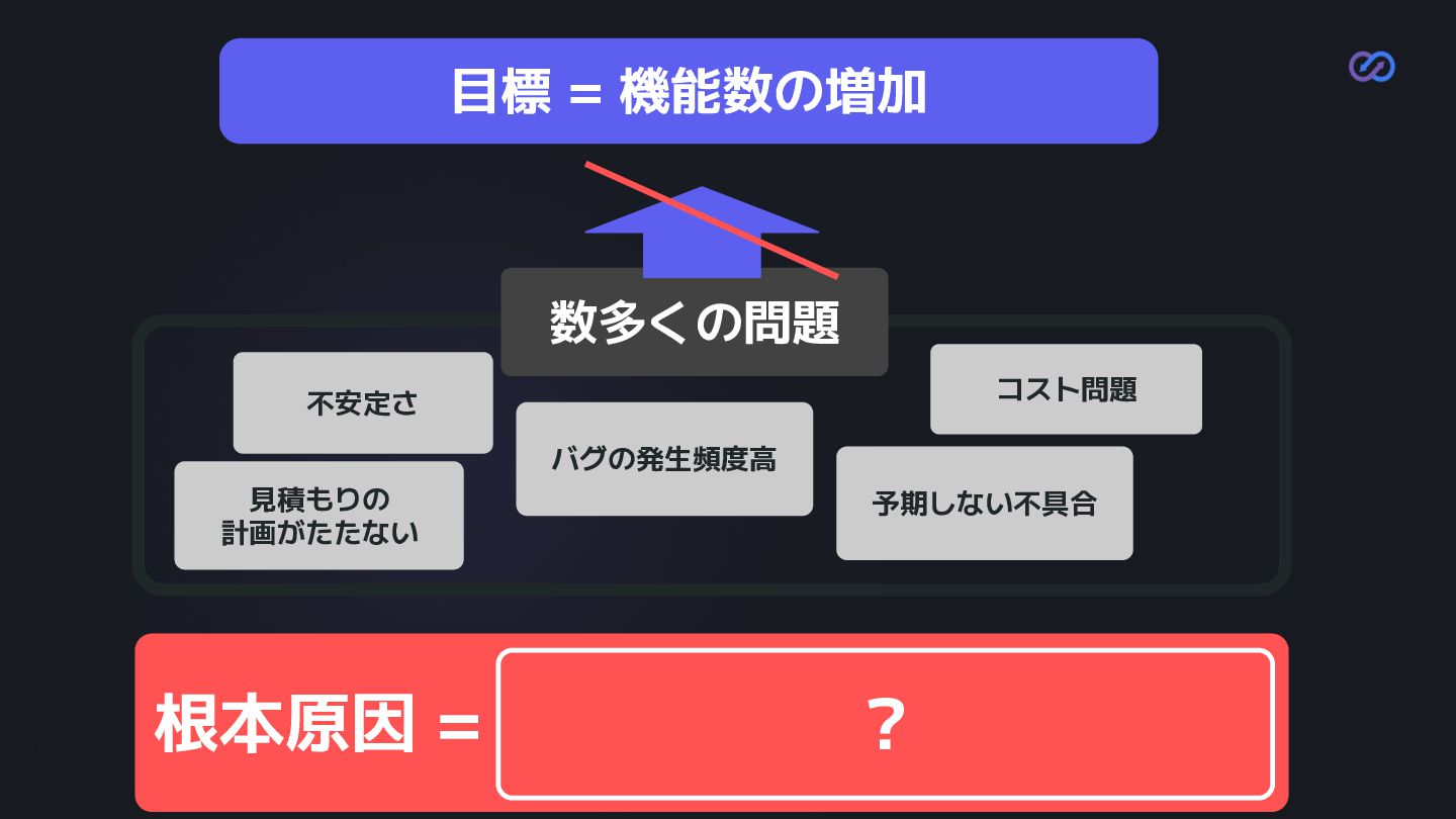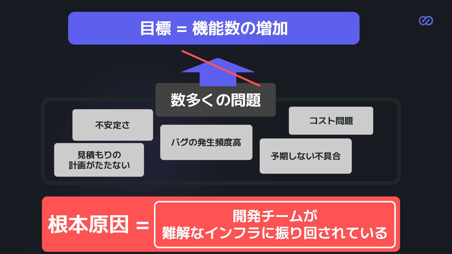 根本原因 = 開発チームが 難解なインフラに振り回されている 目標 = 機能数の増加 不安定さ 見積もりの 計画がたたない
