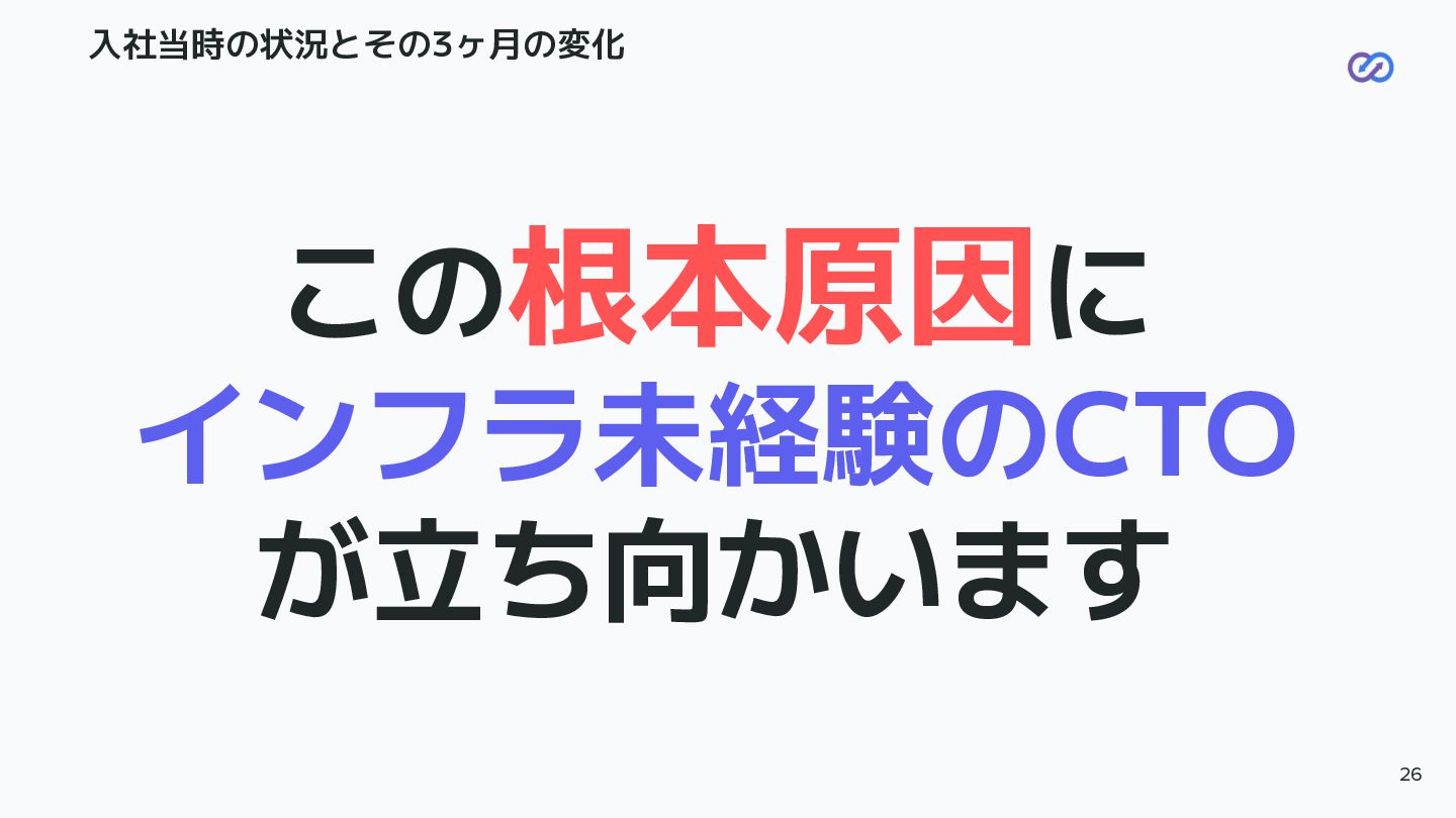 この根本原因に インフラ未経験のCTO が立ち向かいます 26 入社当時の状況とその3ヶ月の変化