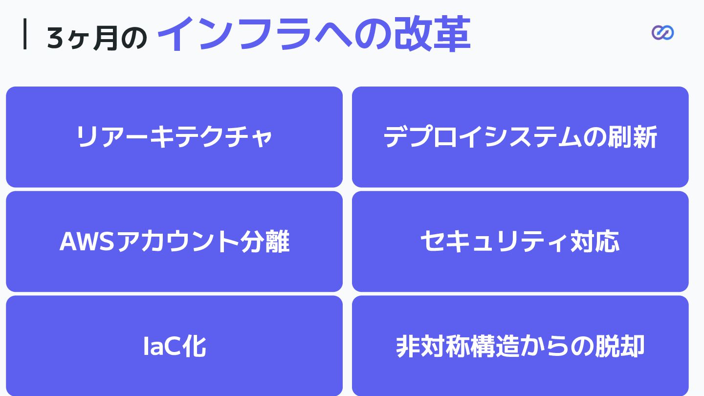 3ヶ月の インフラへの改革 27 リアーキテクチャ AWSアカウント分離 IaC化 デプロイシステムの刷新 セキュリティ対応 非対称構造からの脱却