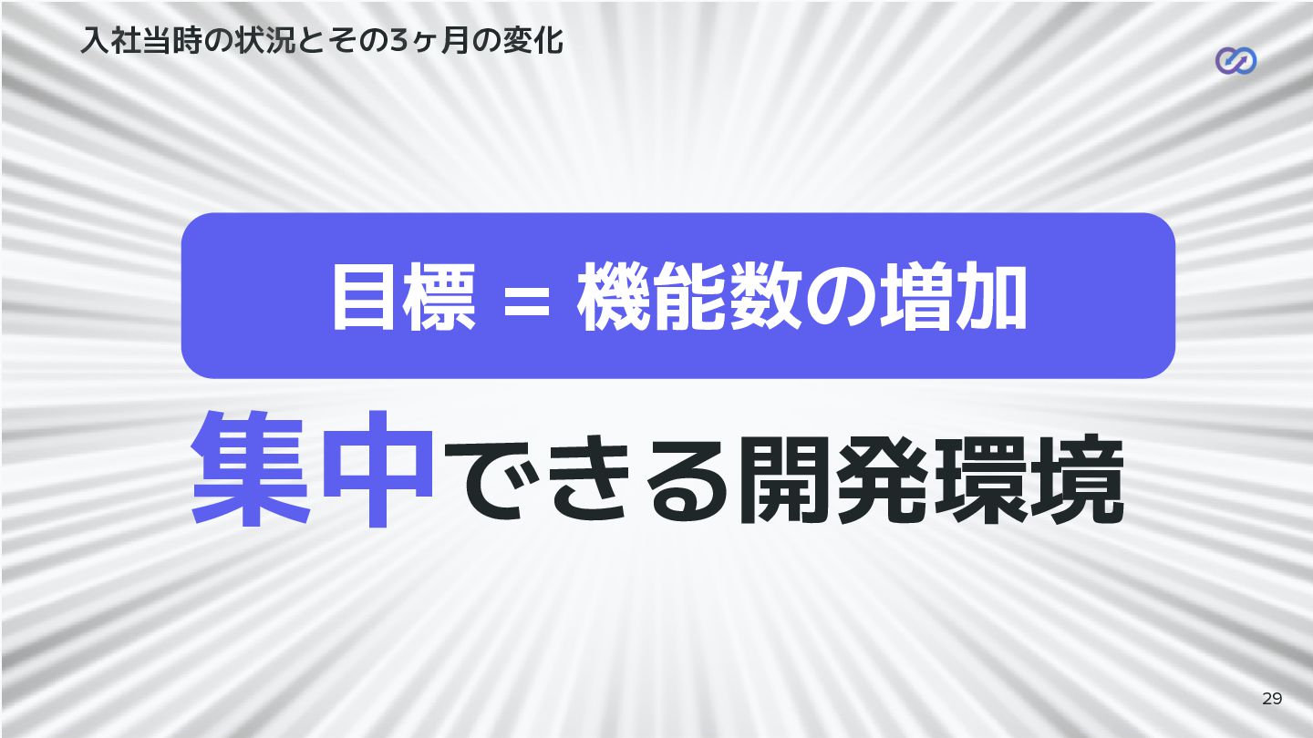 入社当時の状況とその3ヶ月の変化 集中できる開発環境 29 目標 = 機能数の増加
