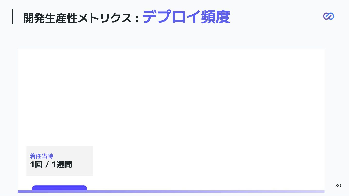 30 着任当時 1回 / 1週間 開発生産性メトリクス : デプロイ頻度