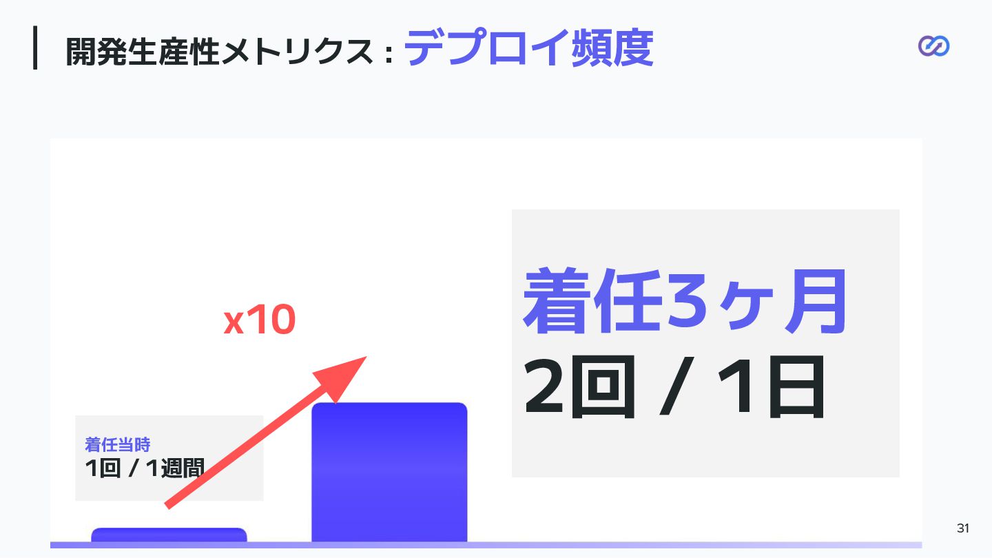 31 着任当時 1回 / 1週間 開発生産性メトリクス : デプロイ頻度 着任3ヶ月 2回