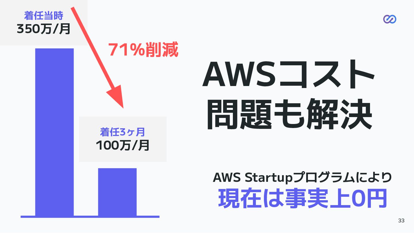 33 着任当時 350万/月 着任3ヶ月 100万/月 AWSコスト 問題も解決 AWS Startupプログラムにより 現在は事実上0円