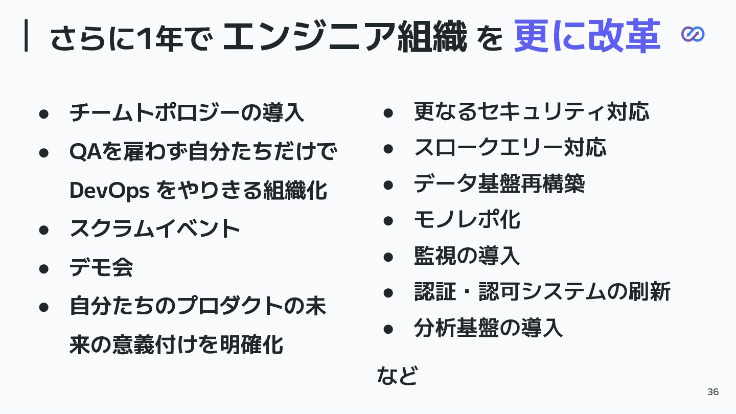 • スクラムイベント • デモ会 • 自分たちのプロダクトの未 来の意義付けを明確化 36 • 更なるセキュリティ対応 • スロークエリー対応 • データ基盤再構築 • モノレポ化 • 監視の導入 • 認証・認可システムの刷新 • 分析基盤の導入 など